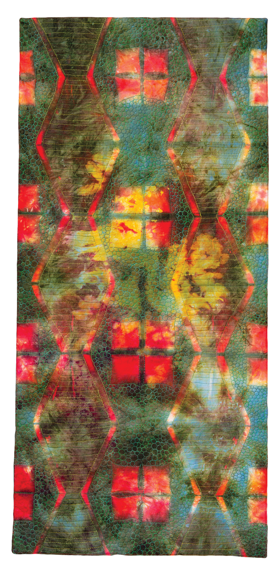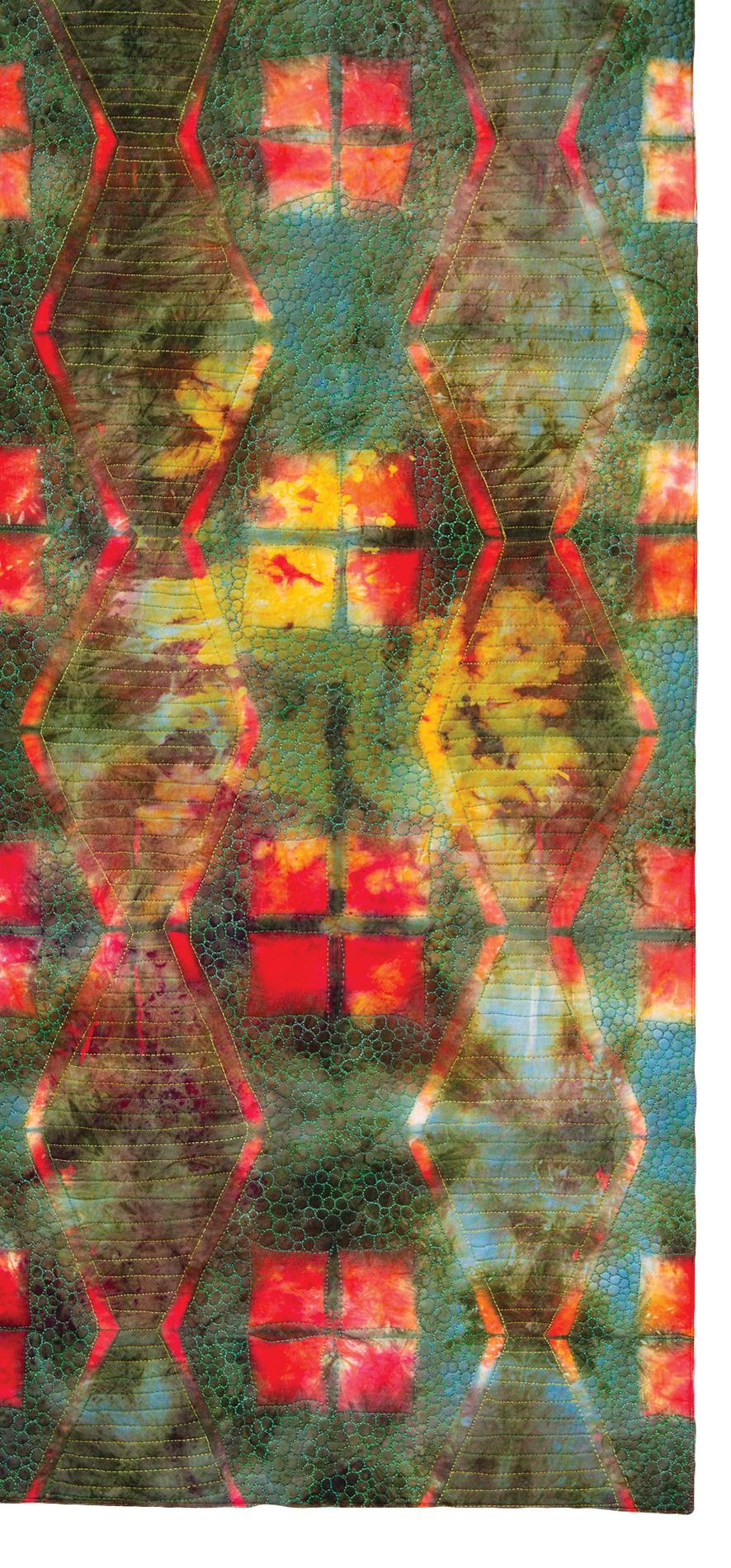 I have been intrigued by the patterns and colors worn by reptiles for many years. My goal was to create these patterns in cloth using dyes and color removal: layering processes and eventually enhancing them with stitch.