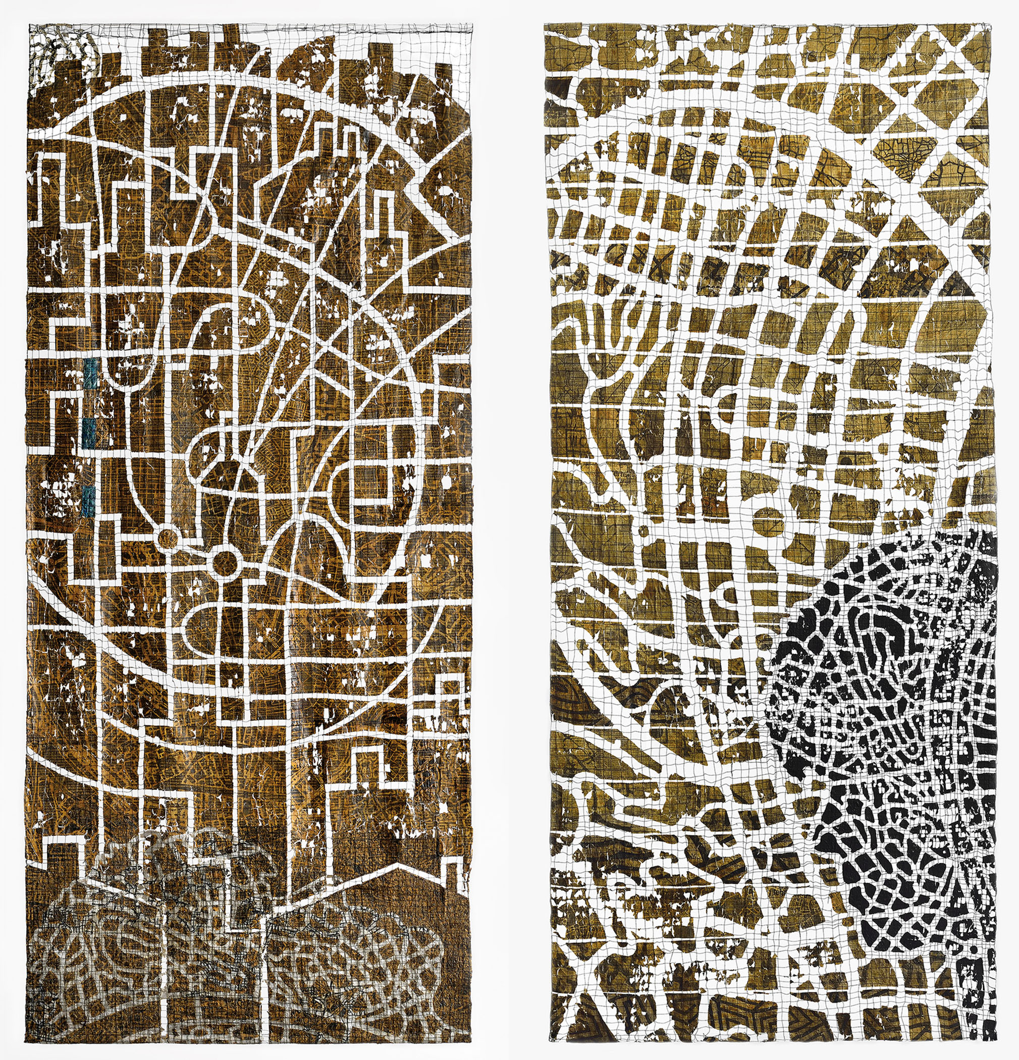 A city map is overlaid with integrated circuit films covered by a grid-like structure representing a map of public transportation system. The underground and circuit boards in computers, are ways to connect people, the former literally and the latter as an essential part of twenty first century living.