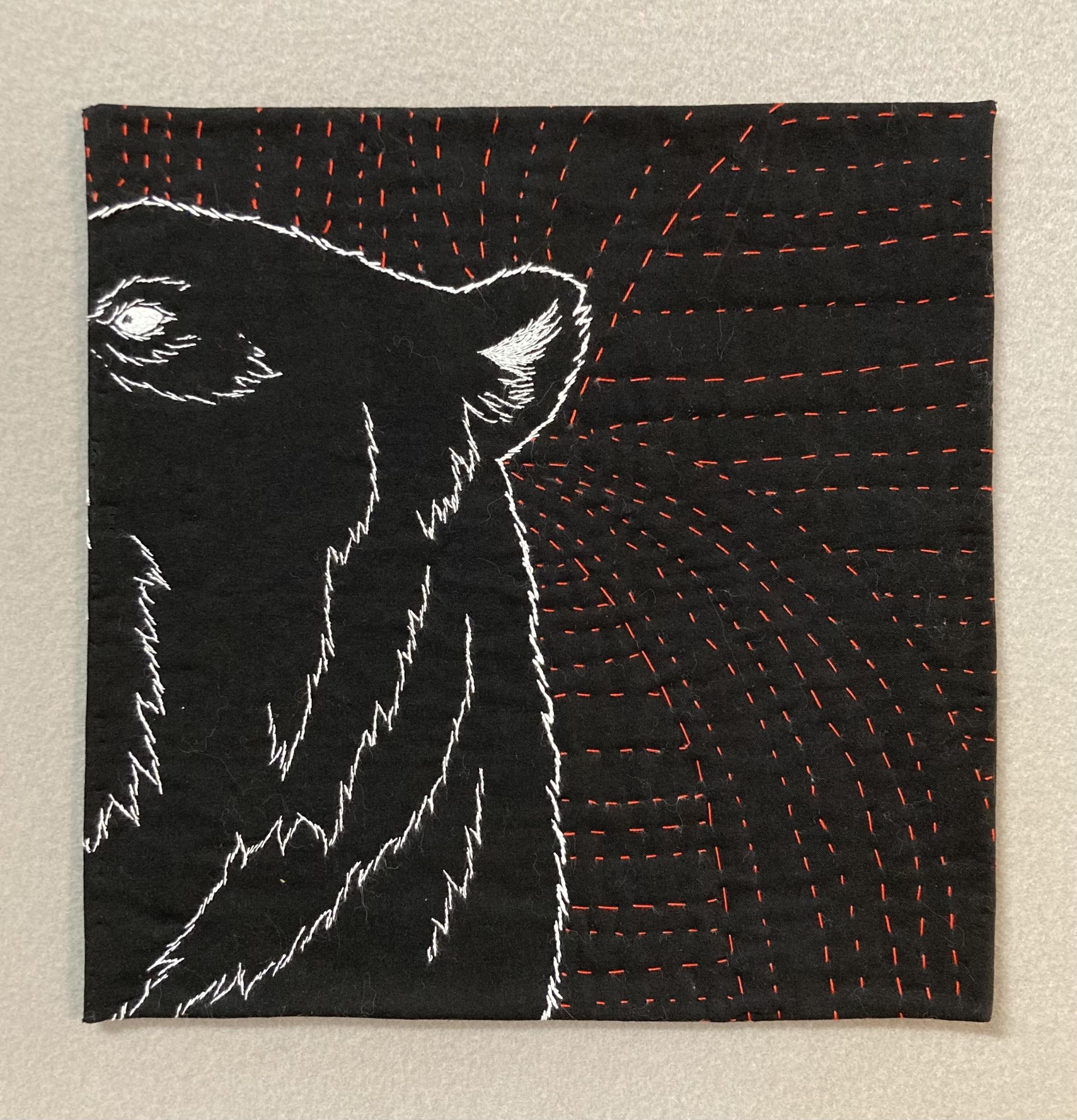 The two sides of this bear attest to the dual nature of the world we live in. On one hand there is the red hot angry bear that has a lot to be mad about as human degradation of the planet has led to habitat loss, pollution, and the endangerment of so many species. Yet, the side with white on black line symbolize the inner lesson of each thing that happens, and the power of healing that can come from within. This is offered up as a prayer for the planet and all that live on the Earth.