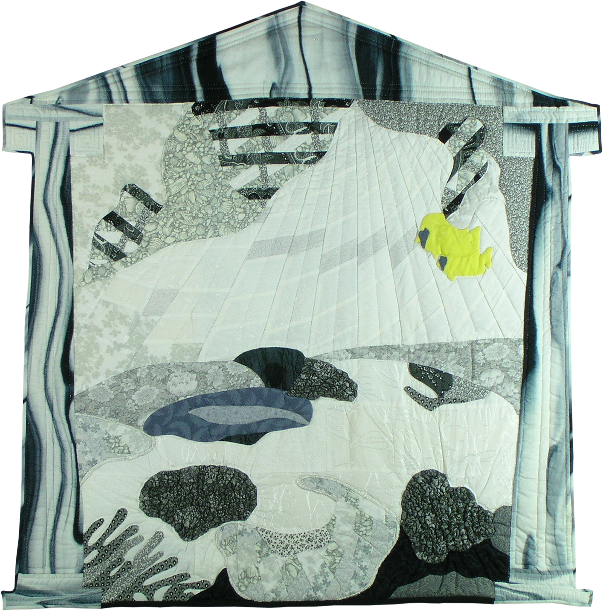 The original plan was to create an underwater coral reef with a couple of tropical fish swimming through. That is where I began. While creating the coral reef it occurred to me how much more interesting it would be to set the scene in Atlantis. Why not use an ancient temple as the frame or border? This required hunting down fabric suggestive of marble and a way to support the quilt from the backside.