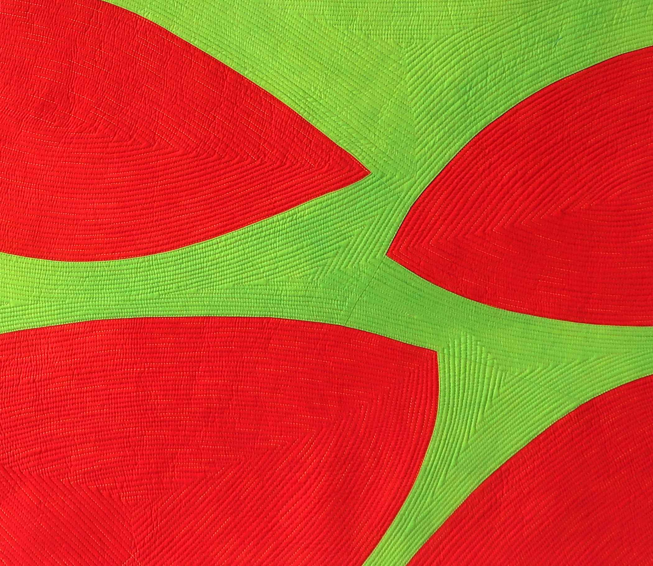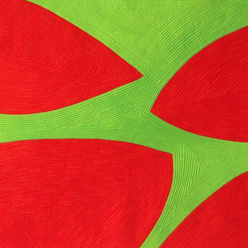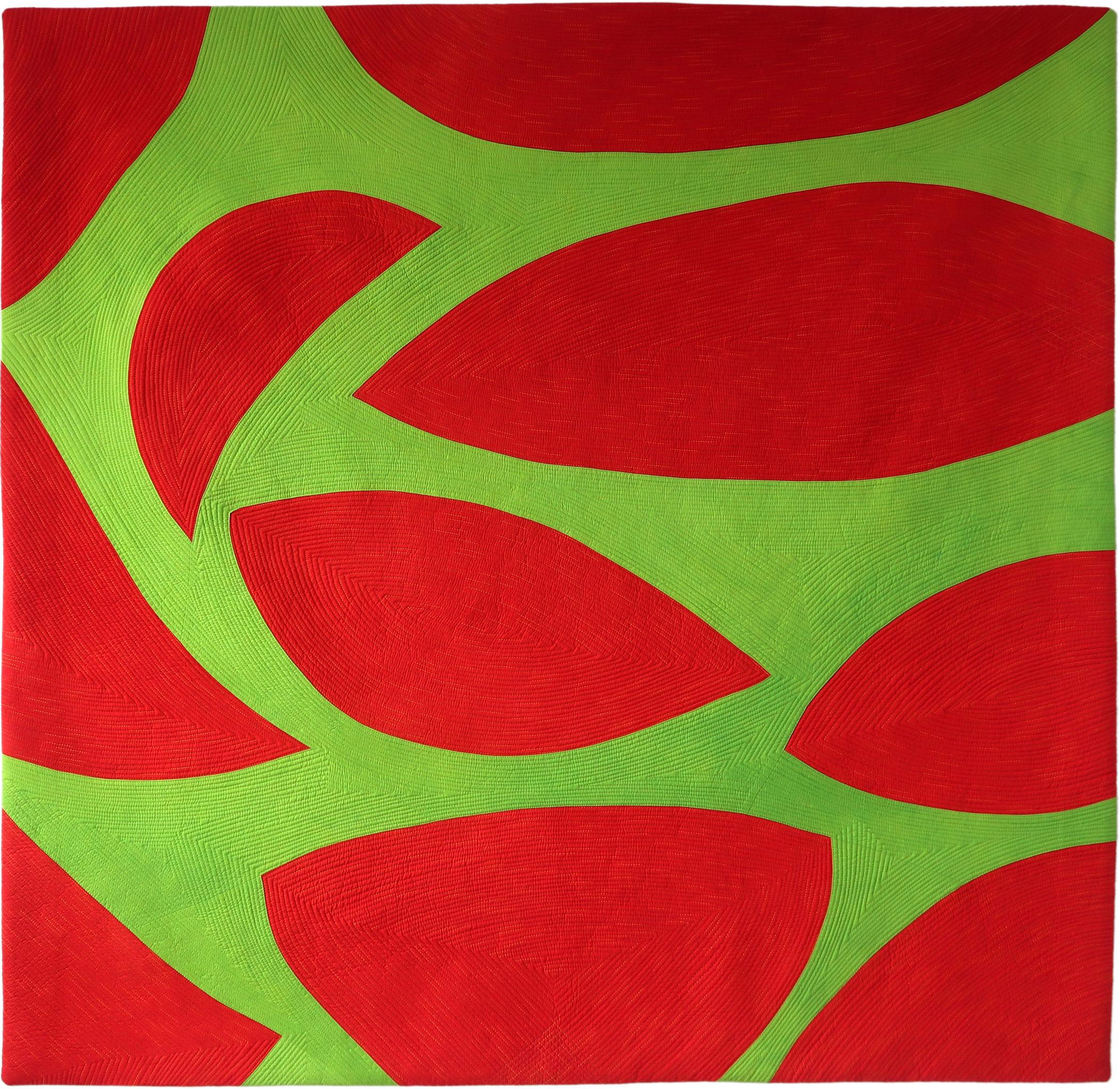 As the woody, cone-like fruit of the coastal banksia mature, the follicles open up to reveal irregular elliptical chambers. Seeds are released to start the cycle of regeneration anew. Nature is replete with such stops and starts. This is reflected in the complementary palette of red and green and the lines of stitching echoing out into the universe.