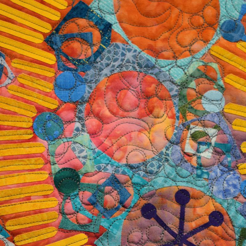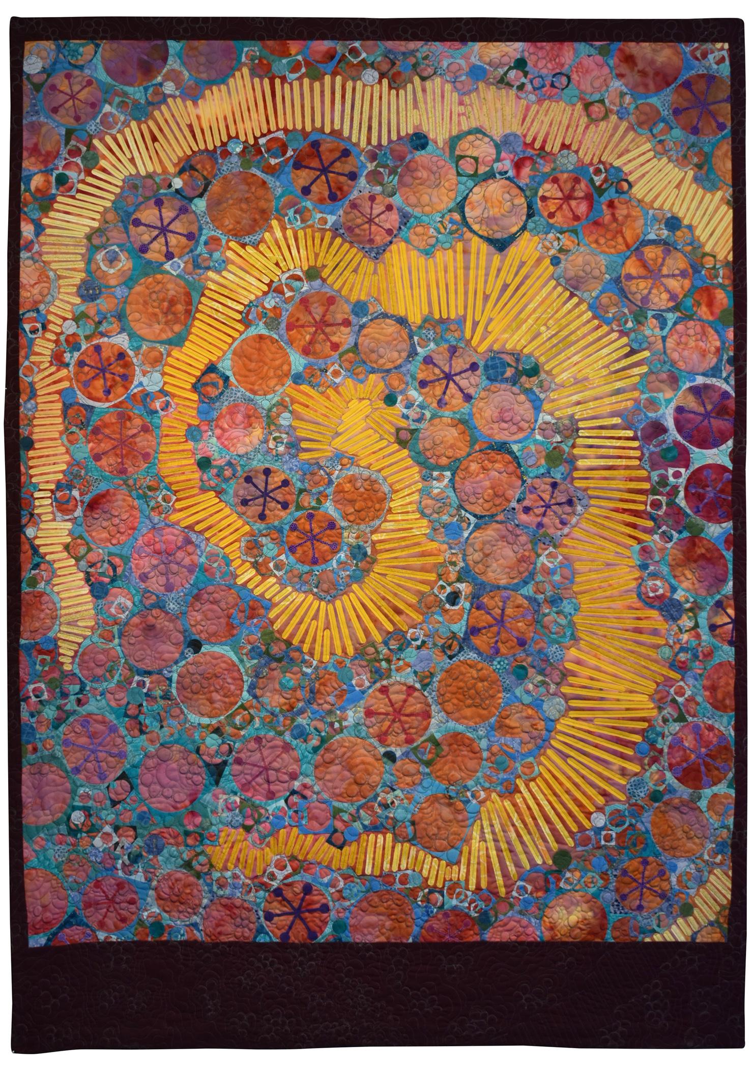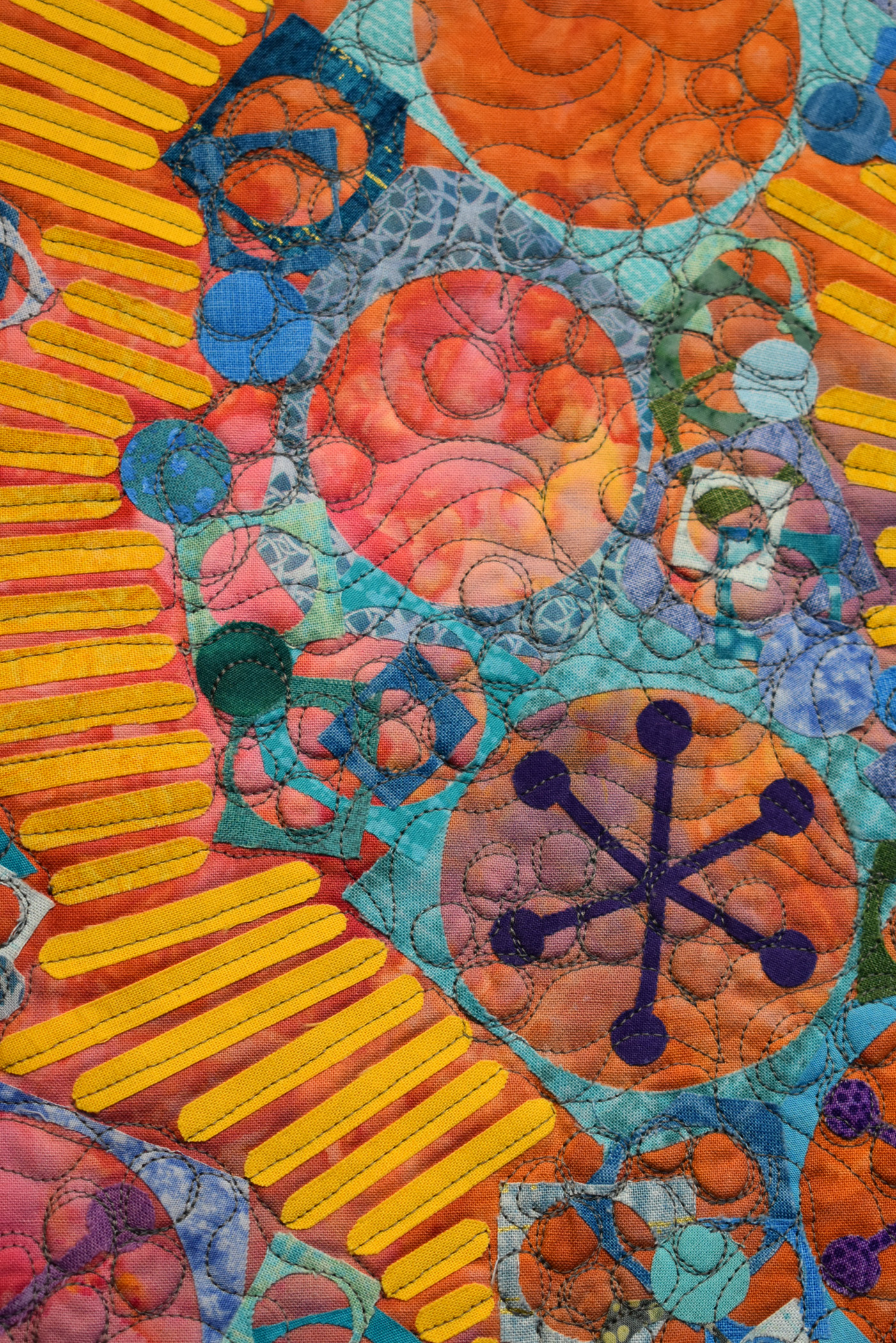 In researching online images of items under magnification, I realized that there were several common shapes: circles, bubbles, and strands. Using the circle and strand shapes, I created this abstract piece. I then quilted the bubble and liquid movement throughout.