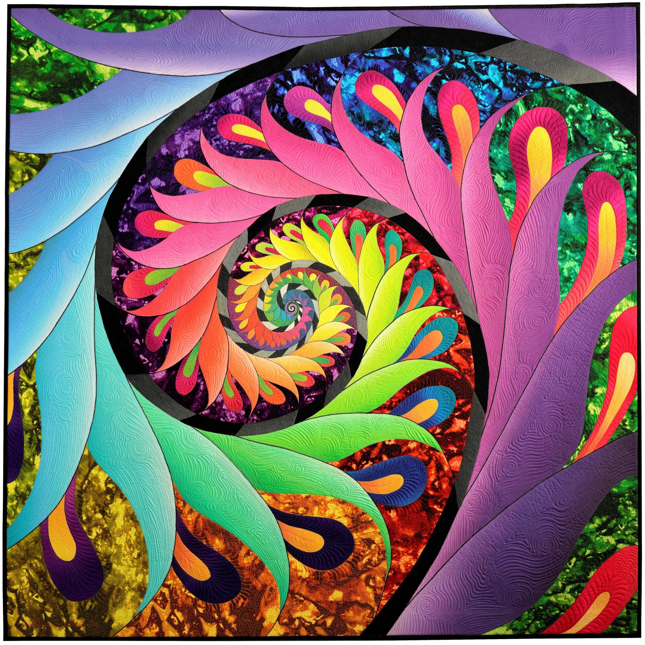 Jacuzzi Jazz #2 is my second quilt inspired by a spiraling fractal. My hand-drawn, pencil-and-ink design was scanned into the computer and colored in Corel Draw. I designed a custom, light-to-dark, colored rectangle for each of the pointed petal shapes, which gradate from deep purple, through the warm half of the color wheel on one side and through the cool colors on the other side. The colored rectangles were printed by Spoonflower, and the shapes were cut from the custom fabric. The entire design was drawn on freezer paper and cut up to make templates. Bud shapes were pieced and appliquéd in contrasting colors, using fabrics from my Gradations collection for Benartex. The patterned background fabrics are from my "Color Flow" collection and they also gradate through the spectrum, beginning with the same green in opposite corners. The spirals strands that separate the two sides of the design alternate between black and gray, and get lighter as they spin toward the center.