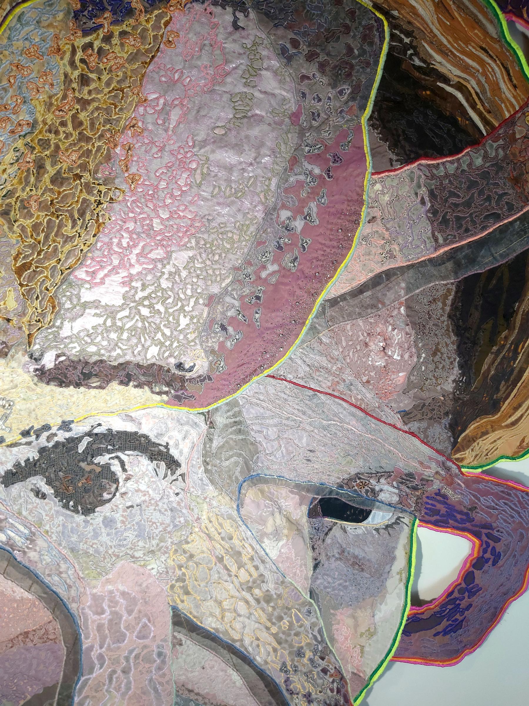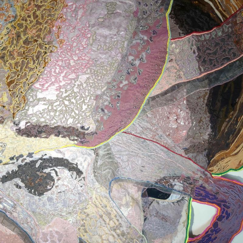 This piece was part of a series on masking: physical, digital, and emotional. I explored camouflage as part of the physical mask. Each piece was altered and made in two versions. The initial completed quilt was just a large portrait of Janine (a fellow textile artist), accomplished entirely through reverse appliqué. I chose her because she depicts endangered species as her thesis. I then made a separate piece of an octopus and merged it into the original portrait of Janine. This new octopus was created in like fabrics and various sheers to give the effect of camouflaging into the original subject, wrapping around the head and becoming a new quilt.