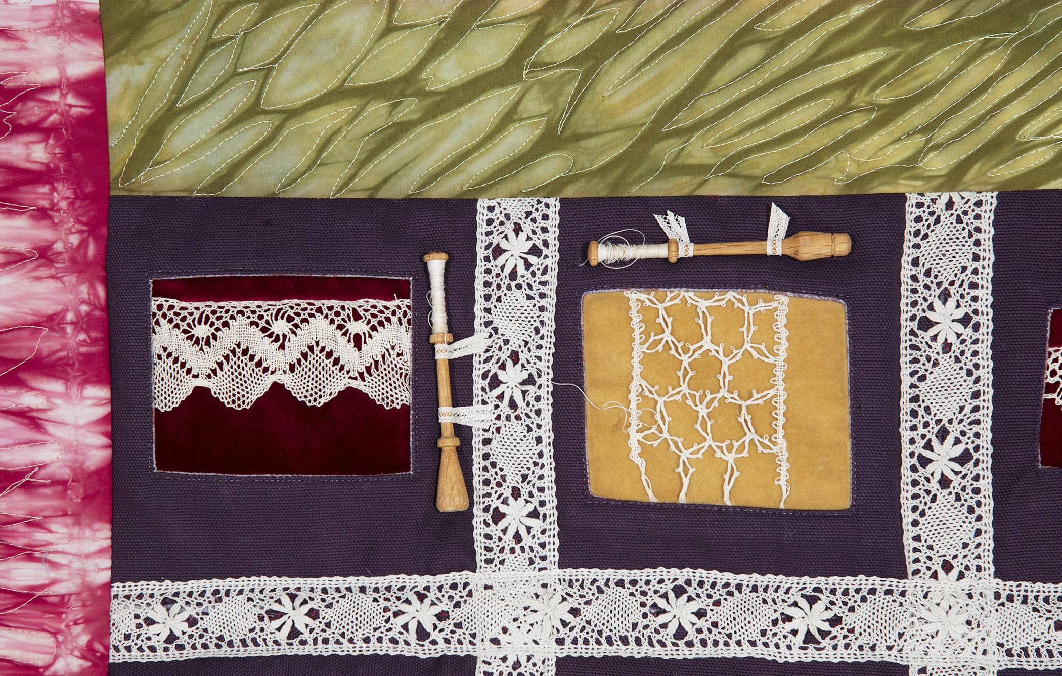Handmade Flemish bobbin lace, commercial lace, velvet, linen, artist-dyed shibori, handcrafted wood bobbins in various woods and styles