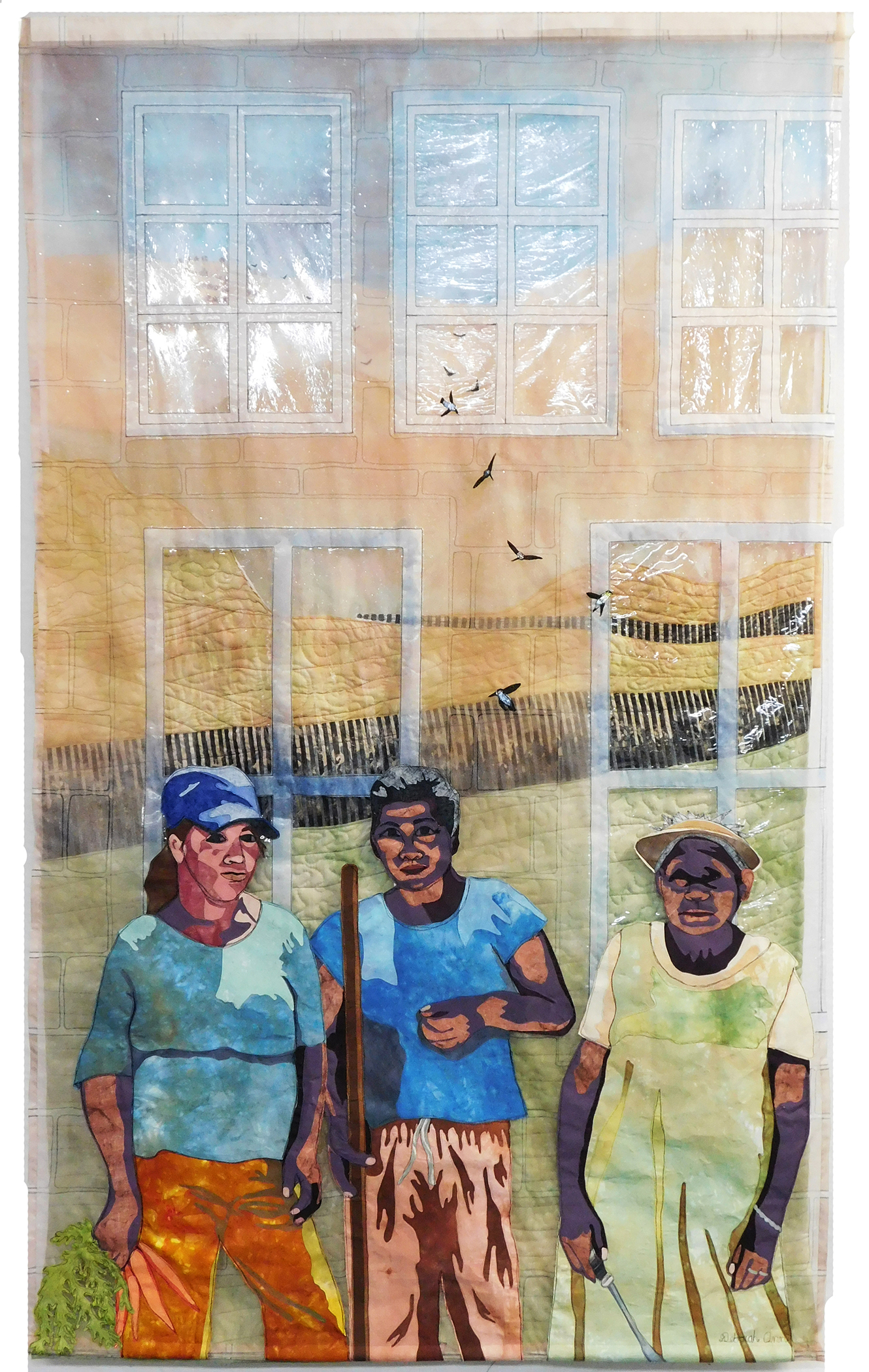 I did this in 3 layers to depict the journey these women ( a mother and her 2 grown daughters) might have taken. I knew them in Mexico and wondered what would happen should they decide to migrate from their village to the USA. In the back layer is a village in the steep hill country where they and the humming birds live.On the center layer is the rugged land that many walk through to get past the fence to the USA. The front layer, on organza has the women as I knew them but now they are in some big city where they don't belong. They remember where they came from and wish they had not made the trip. The humming birds make this crossing every year as a normal part of their lives