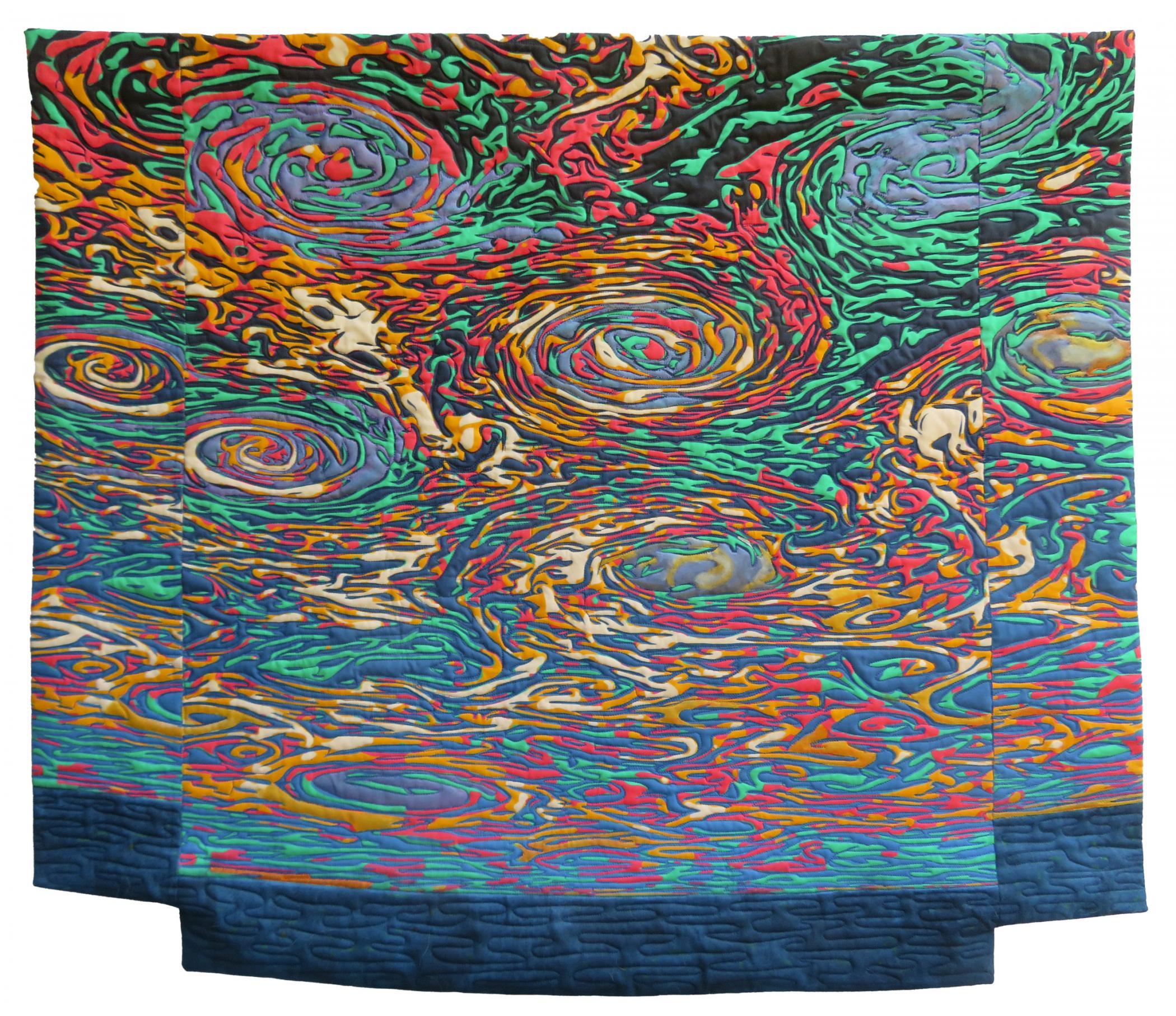 The Juno spacecraft has revealed many wonders about the planet Jupiter since its arrival in 2016. Imagery from Juno has disclosed six gigantic atmospheric cyclones near Jupiter’s south pole. The cyclones extend deep into the icy atmosphere. They are 2,500 to over 4,000 miles wide, with winds exceeding 200 miles per hour. The cyclones have been relatively stable for years. It is hypothesized that forces similar to ocean currents may explain their stability. This quilt depicts those massive cyclones with a bit of digital reinterpretation of the infrared image. Imagery courtesy of NASA/JPL-Caltech/SwRI/ASI/INAF/JIRAM. 025.