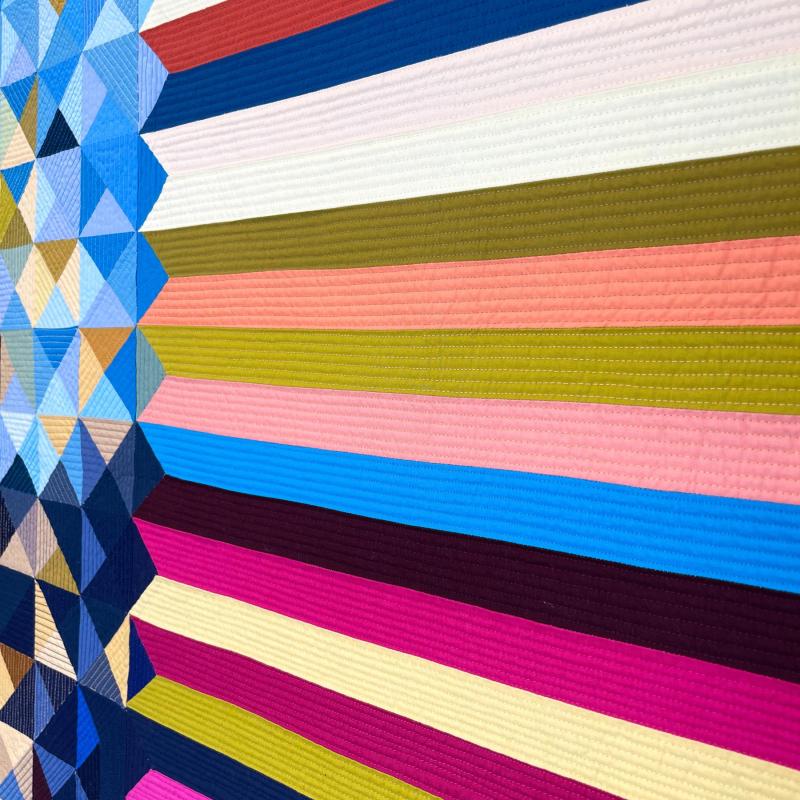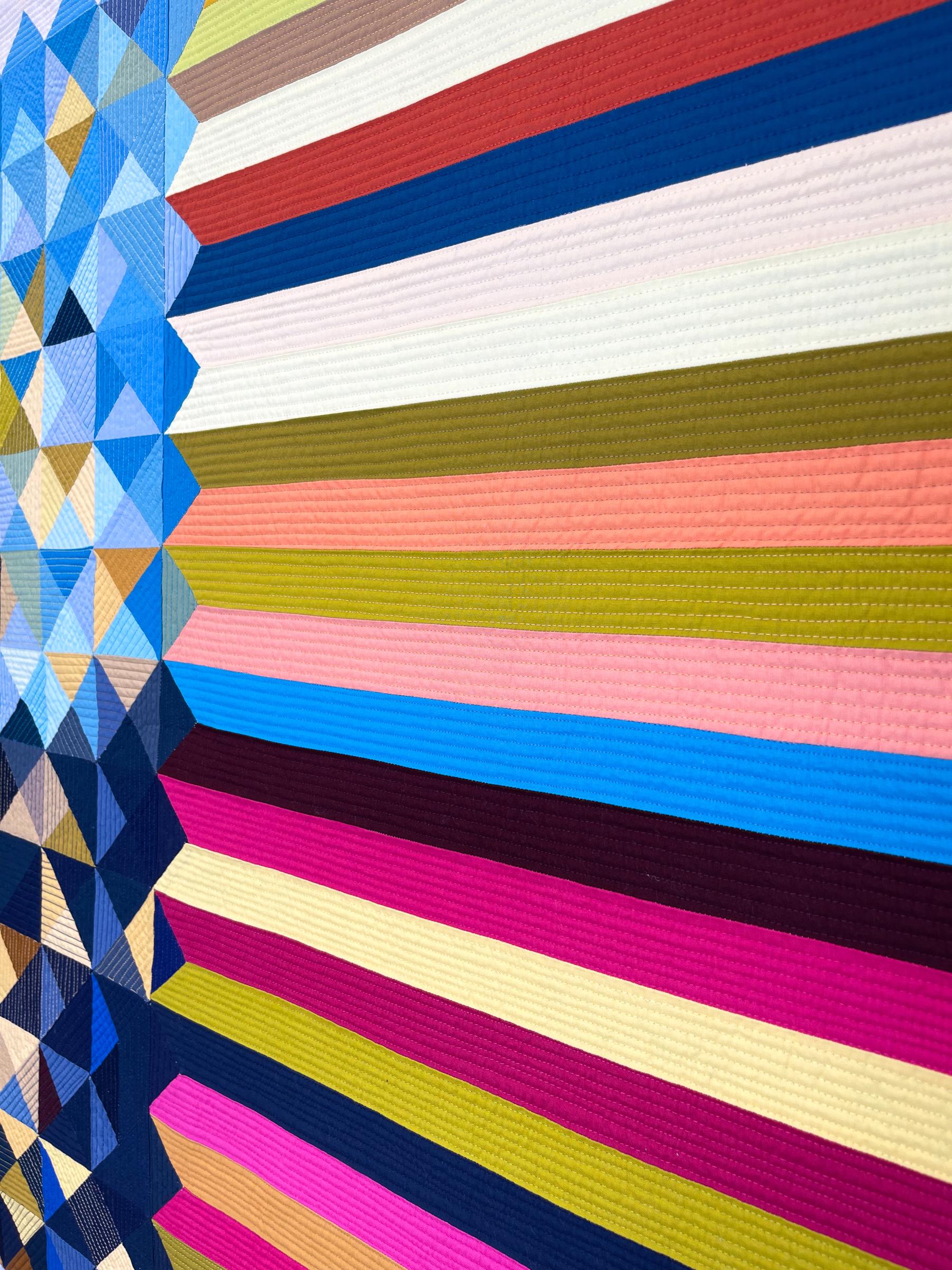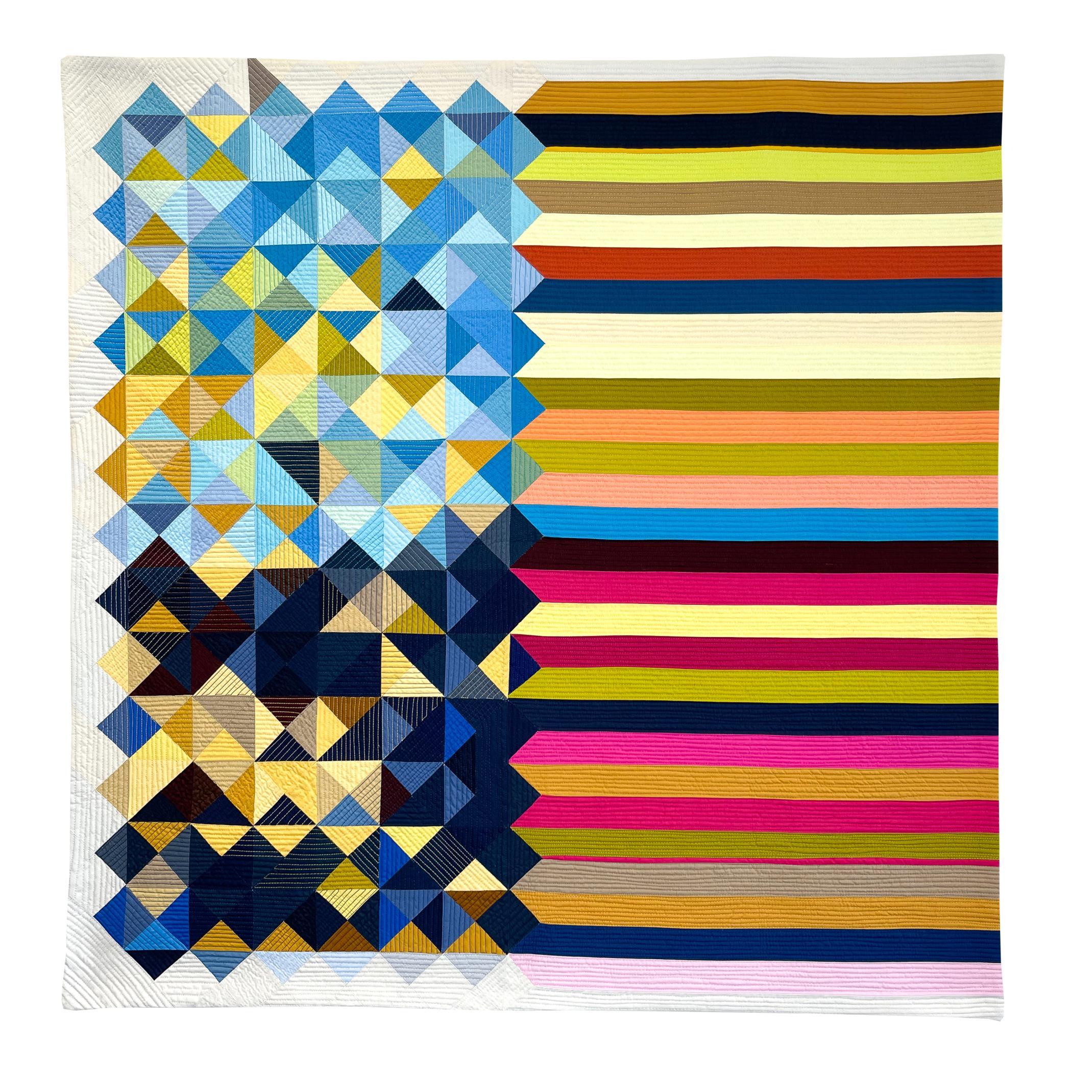 Just Because is the second in a series of quilts concerned with play, process, and the examination of relationships between colors. They have been designed using one original quilt which has been digitally manipulated. The colors in each one split and shift, depending on how the camera sees the piece. The digital manipulations are then used to create physical quilts, Just Because...