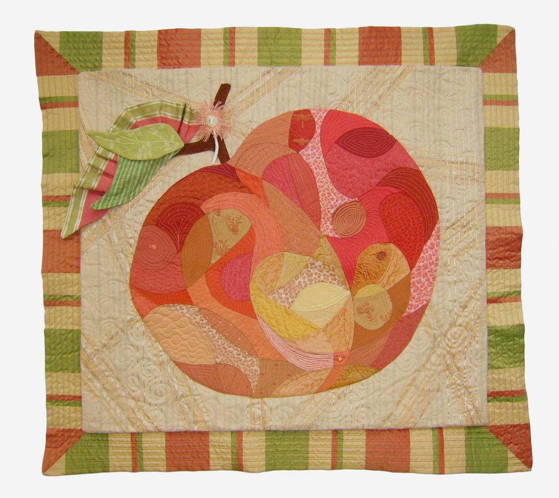 I love creating big graphic fruit, and I was inspired by a classic still life painting. I wanted to give the whole piece a lot of texture, so layers of sheers on the background, along with a whimsical layered leaf, added to the textures of the peach.