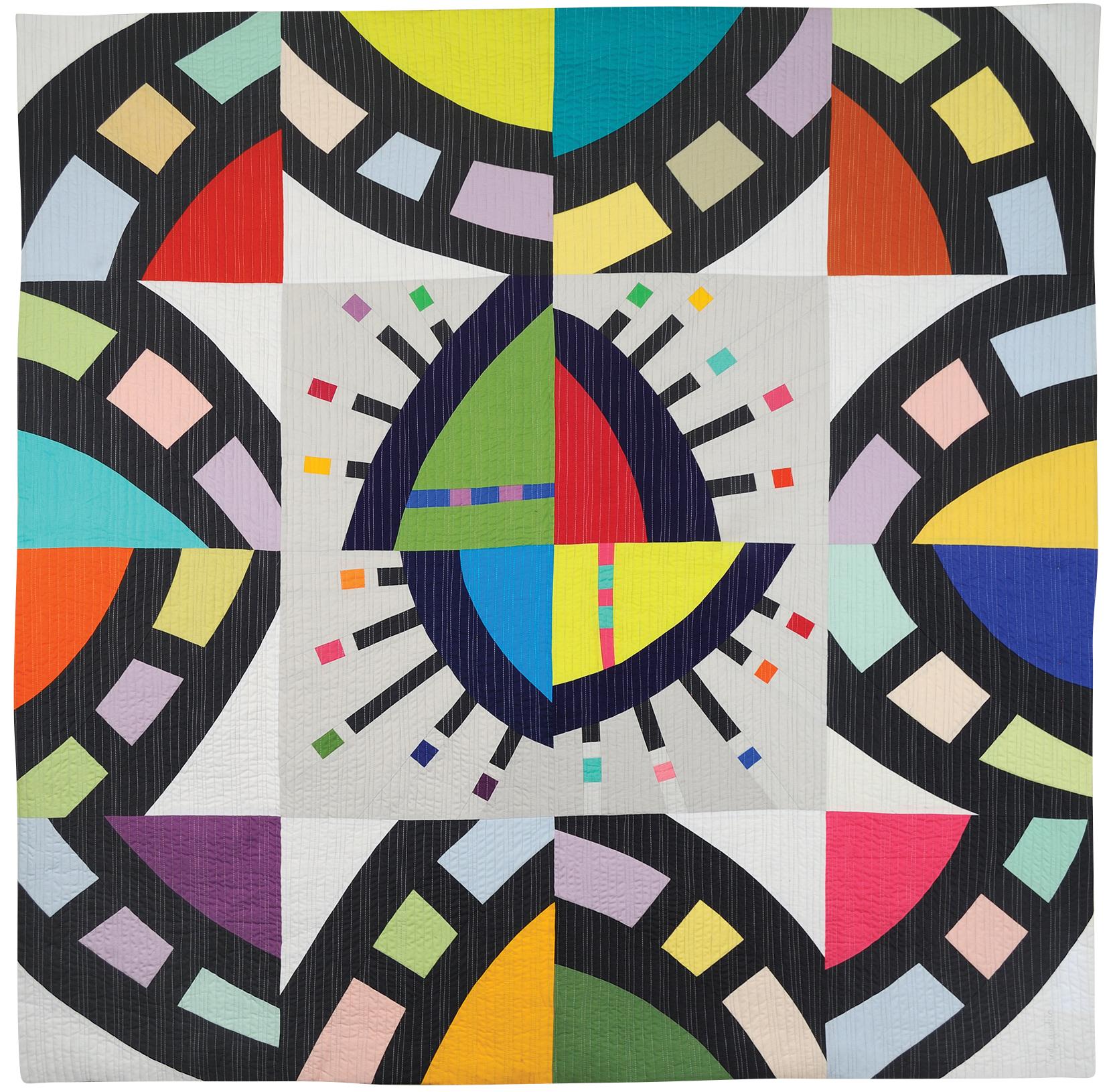 Kaleidoscope is a celebration of curves. I challenged myself to work large, cutting the curves freehand without using templates. Creating lines and shapes directly out of fabric is liberating, engaging me in a dialogue with my materials. The final touch is the texture created by the vertical stitching lines, pulling the composition into a cohesive whole.