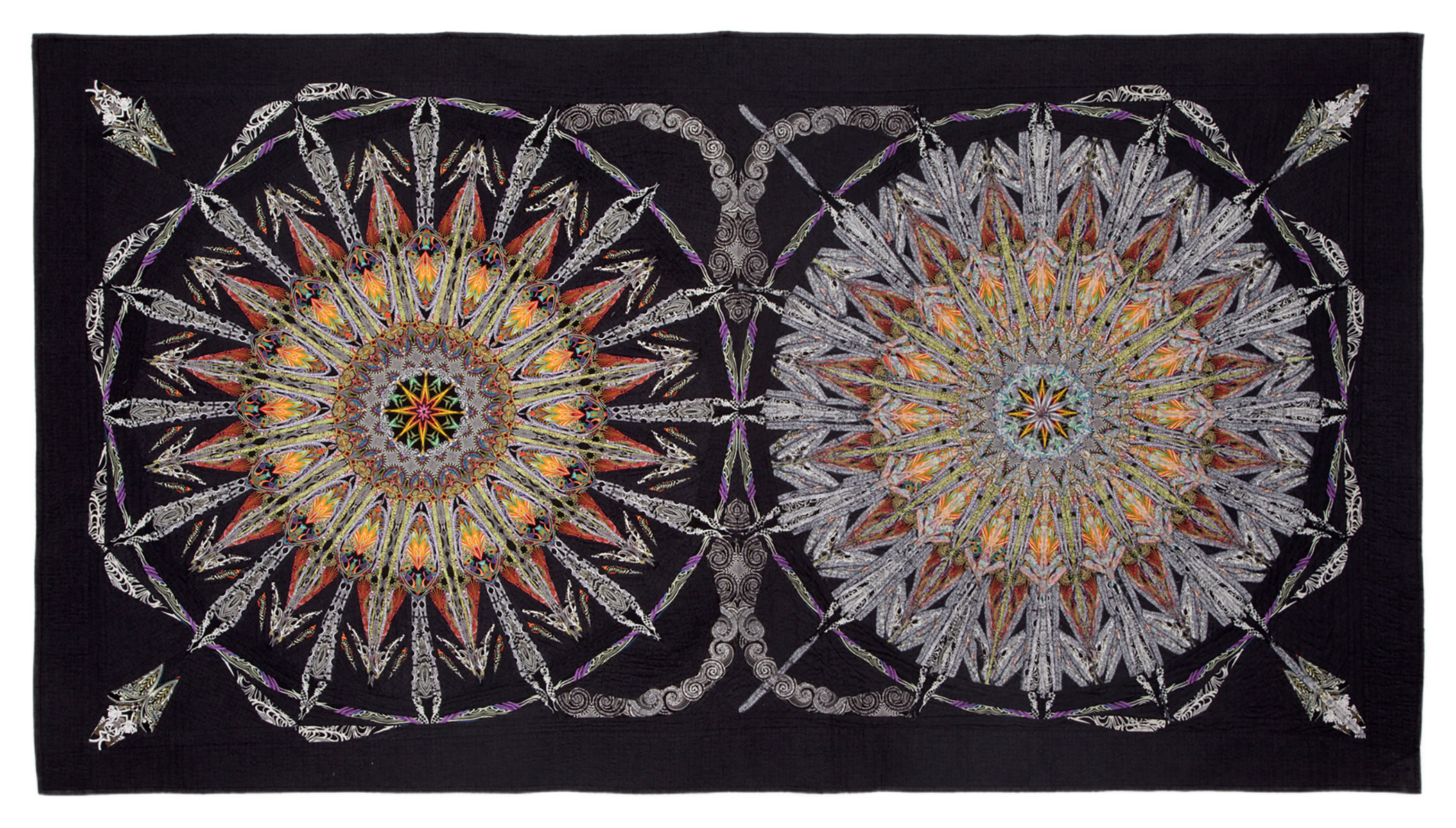 The left kaleidoscope was pieced traditionally by sewing the right sides of the fabric together. The patches of the right kaleidoscope are identical to the left one but pieced sewing the wrong sides of the patches together. A single layer of black tulle covers the right kaleidoscope.