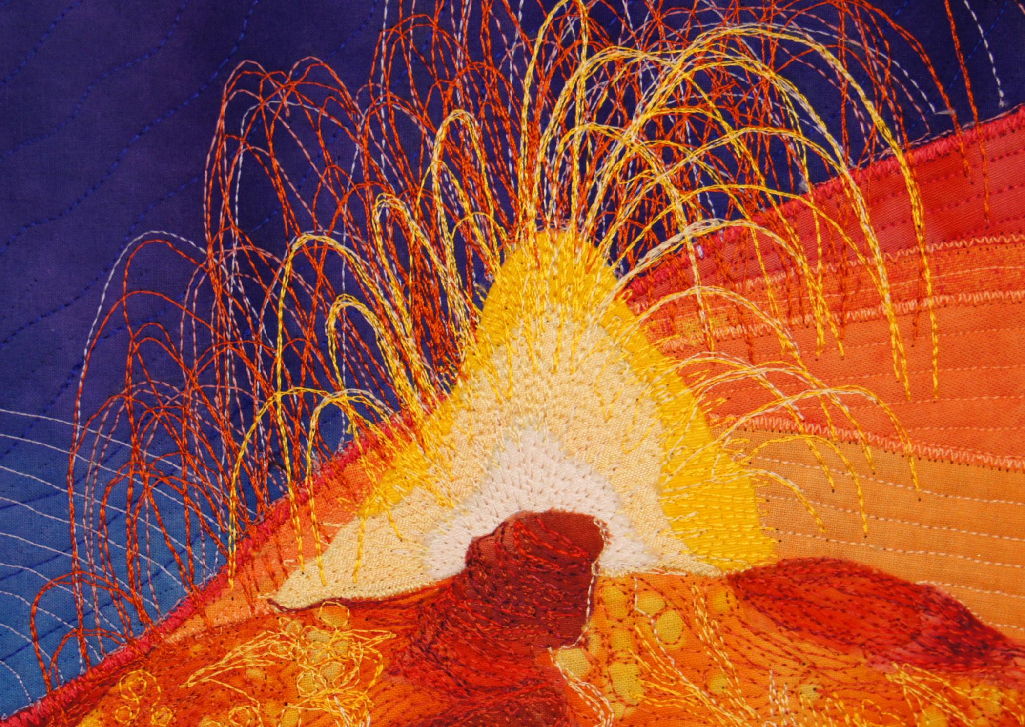 This quilt shows some of the eruptions that have taken place at the Kilauea volcano in Hawaii. It shows the amazing fireworks that appear when it is erupting.