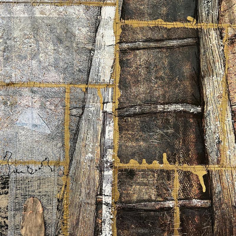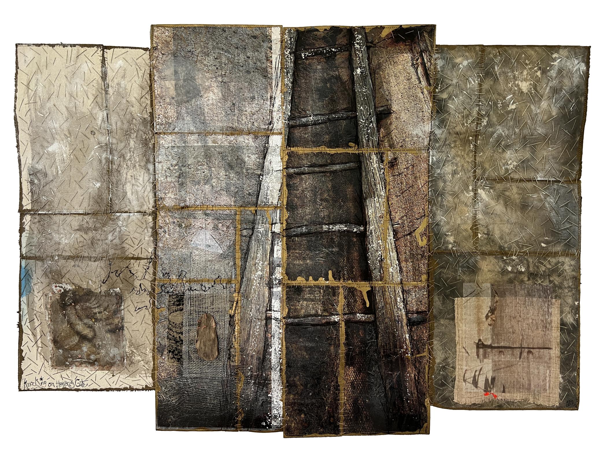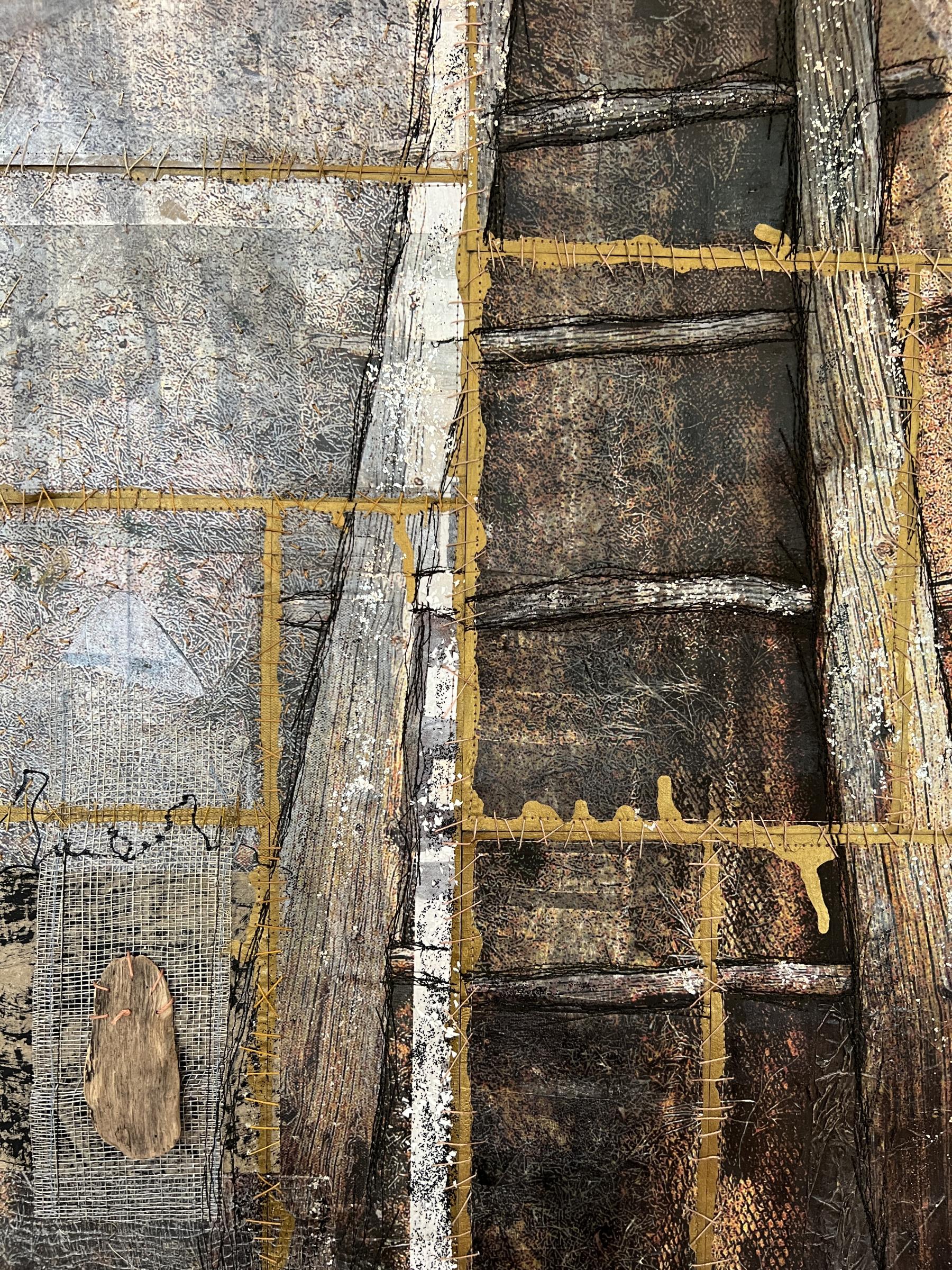 Found adobe ladder begs the question, where does it go? What is up there? Hidden collage elements underlay the artist-printed image. They are just under the surface, there but unseen, like the sun on a cloudy day. What will we find when the veil is lifted?