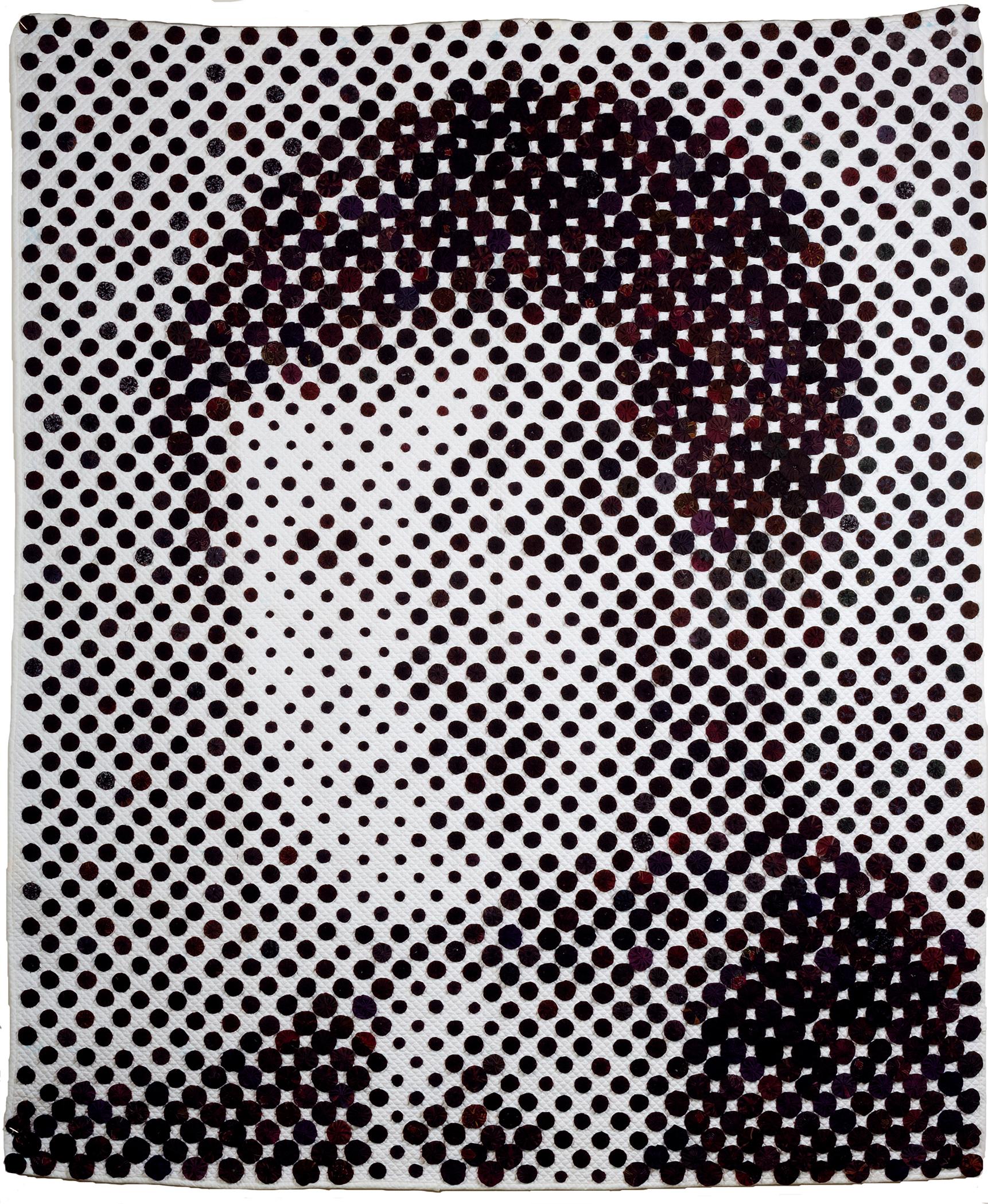 Using "yo-yos" as the building blocks of each, I formed likenesses of my husband, Ku-sup. For the past two years, my husband, Ku-Sup, a specialist on ethnic relations, has written articles for the Korea Daily Newspaper. The image for this particular work comes from the bi-monthly articles that he writes. Since the original image was made using a half-tone printing process the large dots that comprise it are more distinct once the photo is enlarged. After enlarging it, I made yo-yos in varying shades of purple and in sizes corresponding to the enlarged dots. When viewed from afar, the sharp contrast between the purple yo-yos and the white background make it appear to be a black and white image. When one is viewing it within close range, each dot is clearly distinguished from its neighbors, but the entire image is lost at this proximity.