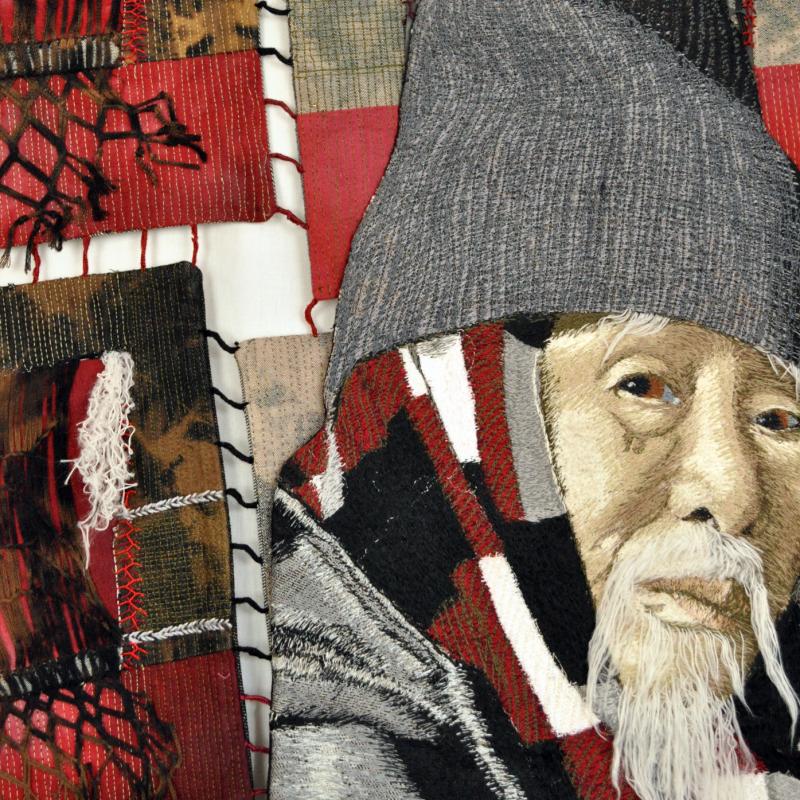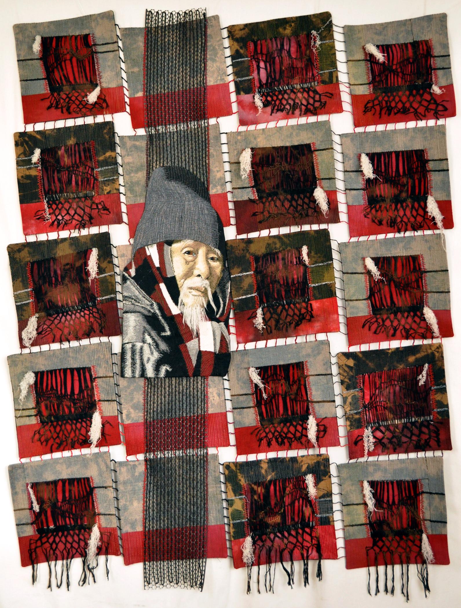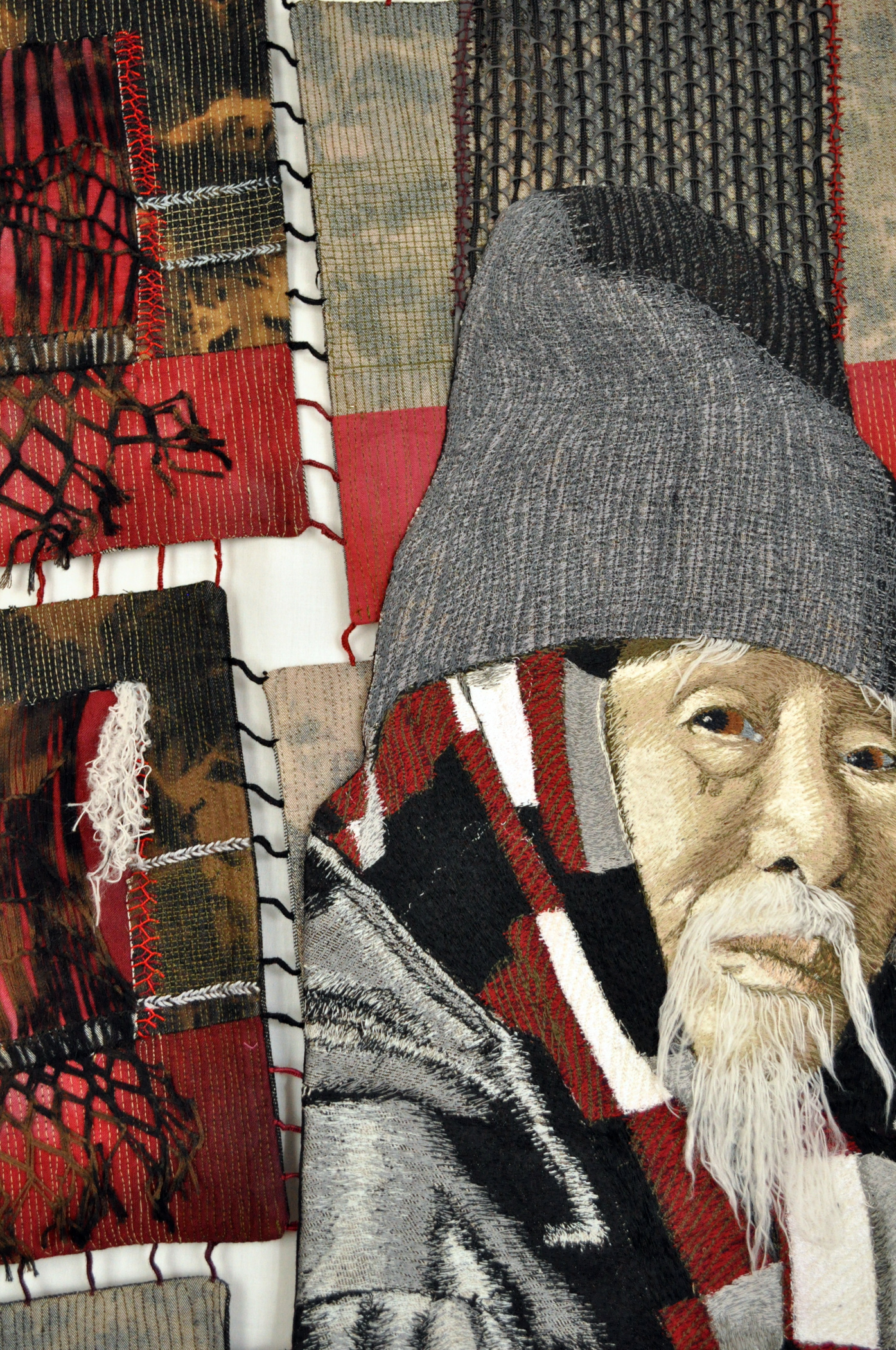 Obtaining permission from the photographer Catherine Juillerat to use in my work her black and white portrait of Mr. CHU, a Vietnamese Master in embroidery has become an imperative. This accomplished, begins the journey. Undoing the weft by removing the threads and then reworking the remaining ones differently in each block , tilting these blocks in the background and keeping them in balance, using strong colors - white, black and red - all to symbolize the struggle, energy and perseverance needed to accomplish the life's long journey. Finally, my pleasure: the portrait.