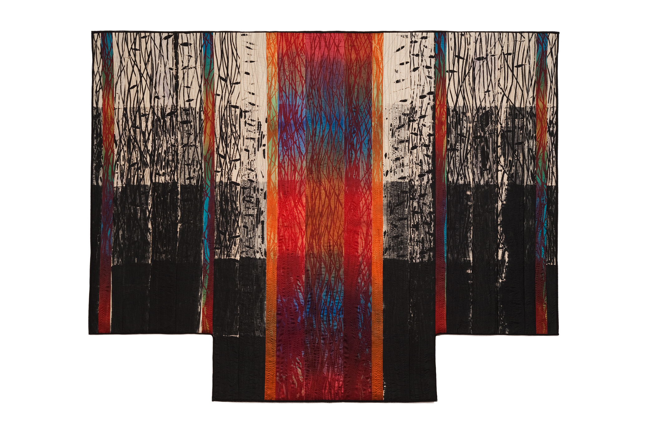Arashi shibori and Itajime shibori dyed, discharged, pieced, quilted.