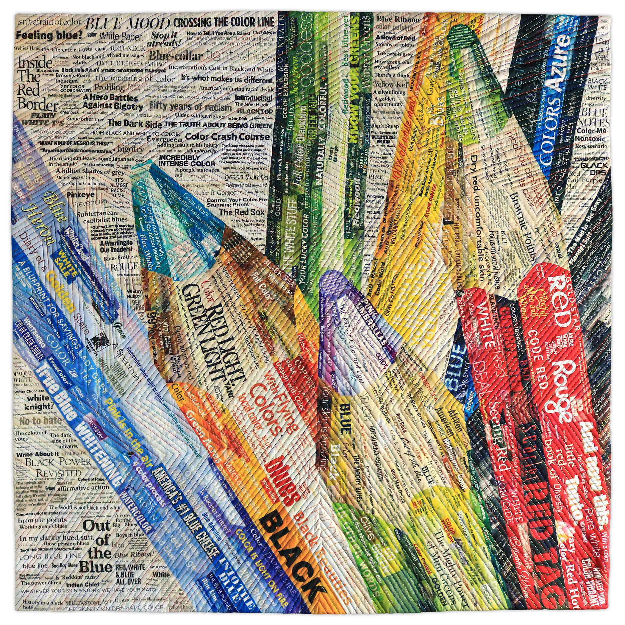 Collaged newspaper/magazine clippings digitally printed on fabric. Machine quilted.