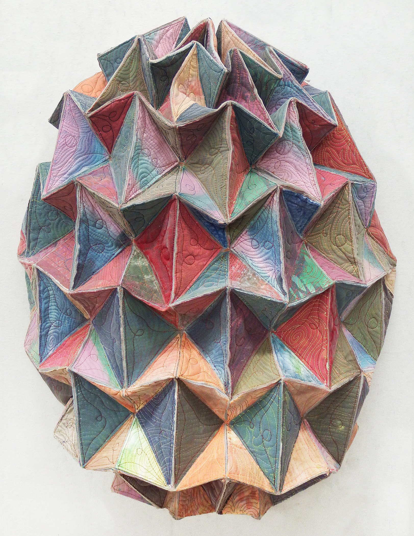 This piece is part of my series inspired by origami corrugations, and explores ways to use traditional paper-folding techniques as a novel way to bring depth and shape to my art quilts. The half-barrel lantern shapes evoke light and illumination, here provided with the color and texture of quilted, fabric.
