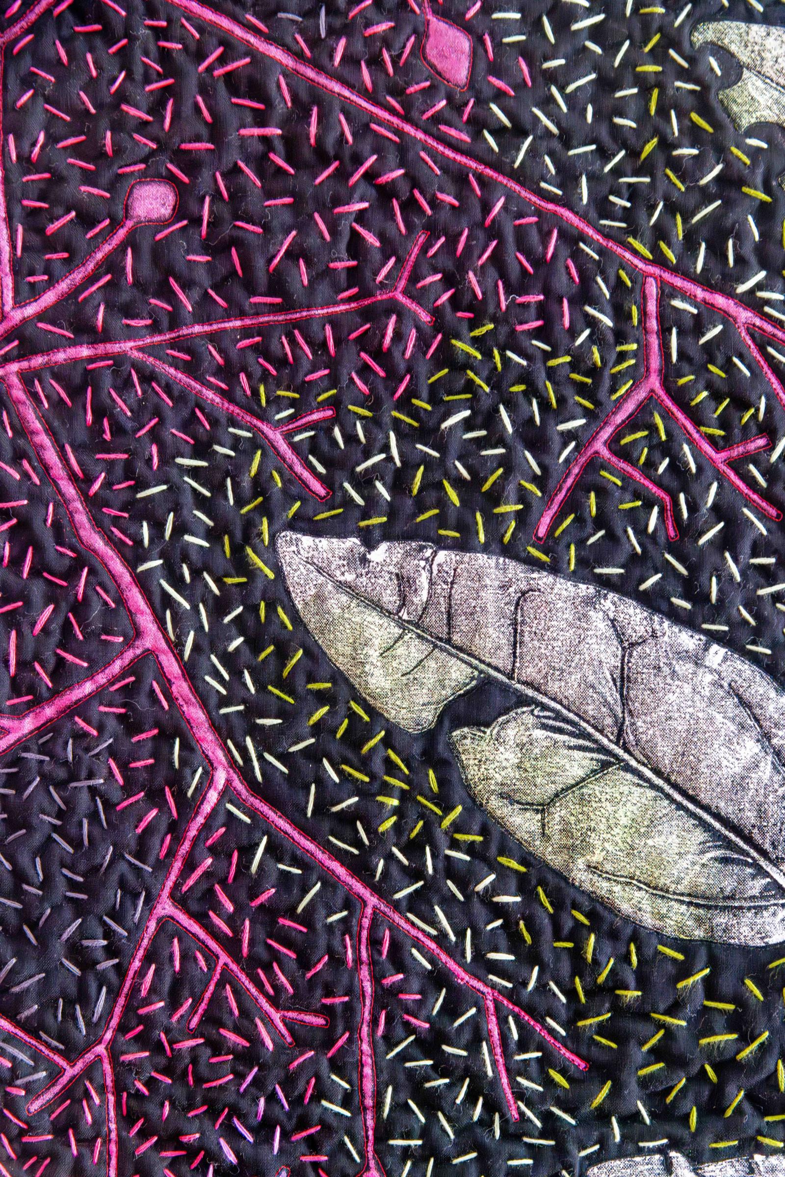 Leaf Mandala is a celebration, using print and stitch, of the flowering energy of the Australian Illawara Flame Tree. During Spring and Summer when this deciduous tree flowers, it is a riot of red bell-shaped flowers quivering on red stems. Small new leaves then appear and change shape as they mature, as seen in the mandala prints.