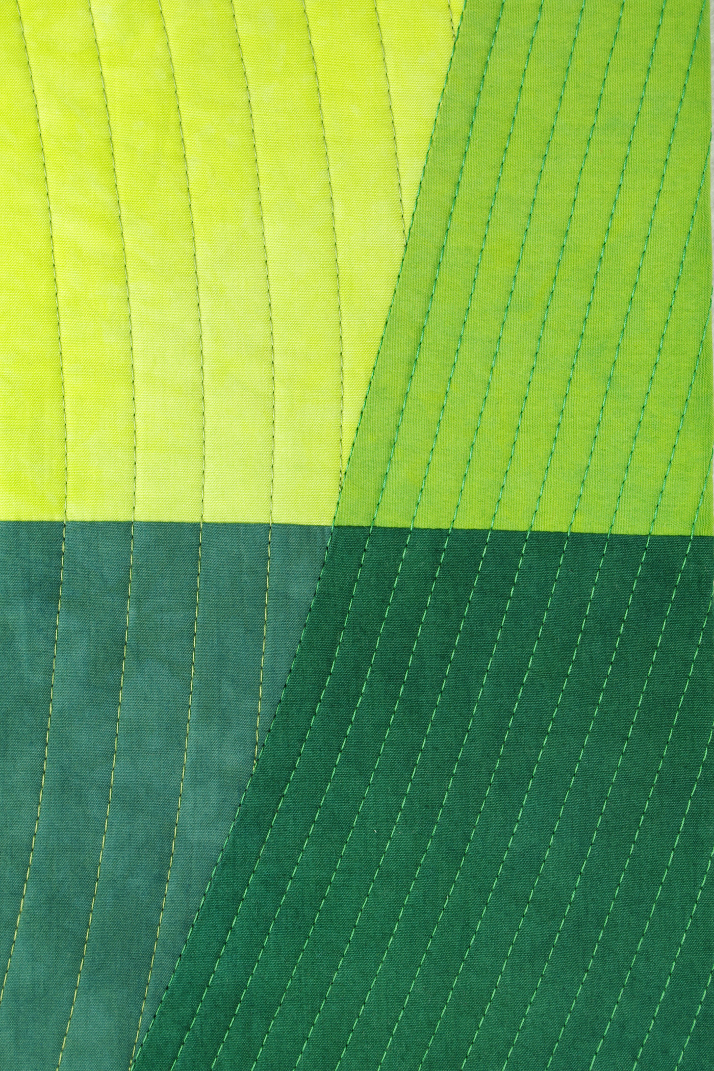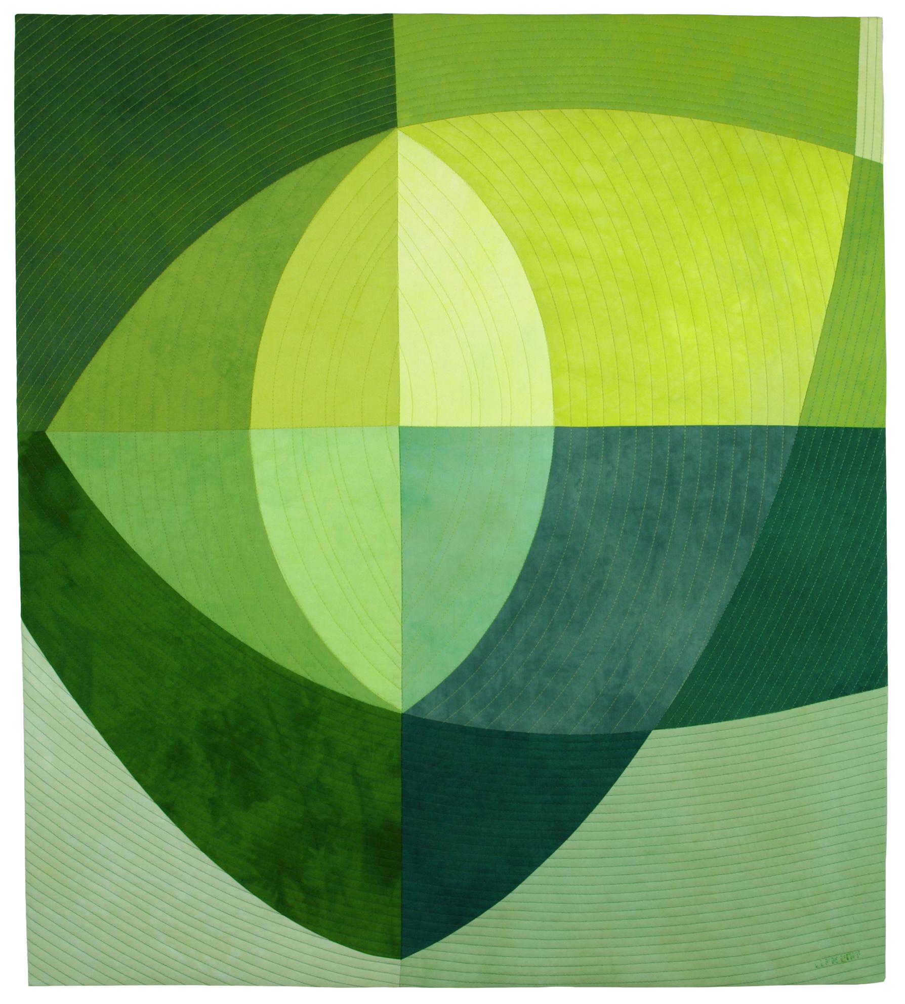 In my Leaf Stack series, I am using the simple shape of a leaf to abstract and explore implied overlapping of forms, transparency and intersections of lines. The layered effect is achieved through the use of color. There is only one layer of fabrics pieced together.