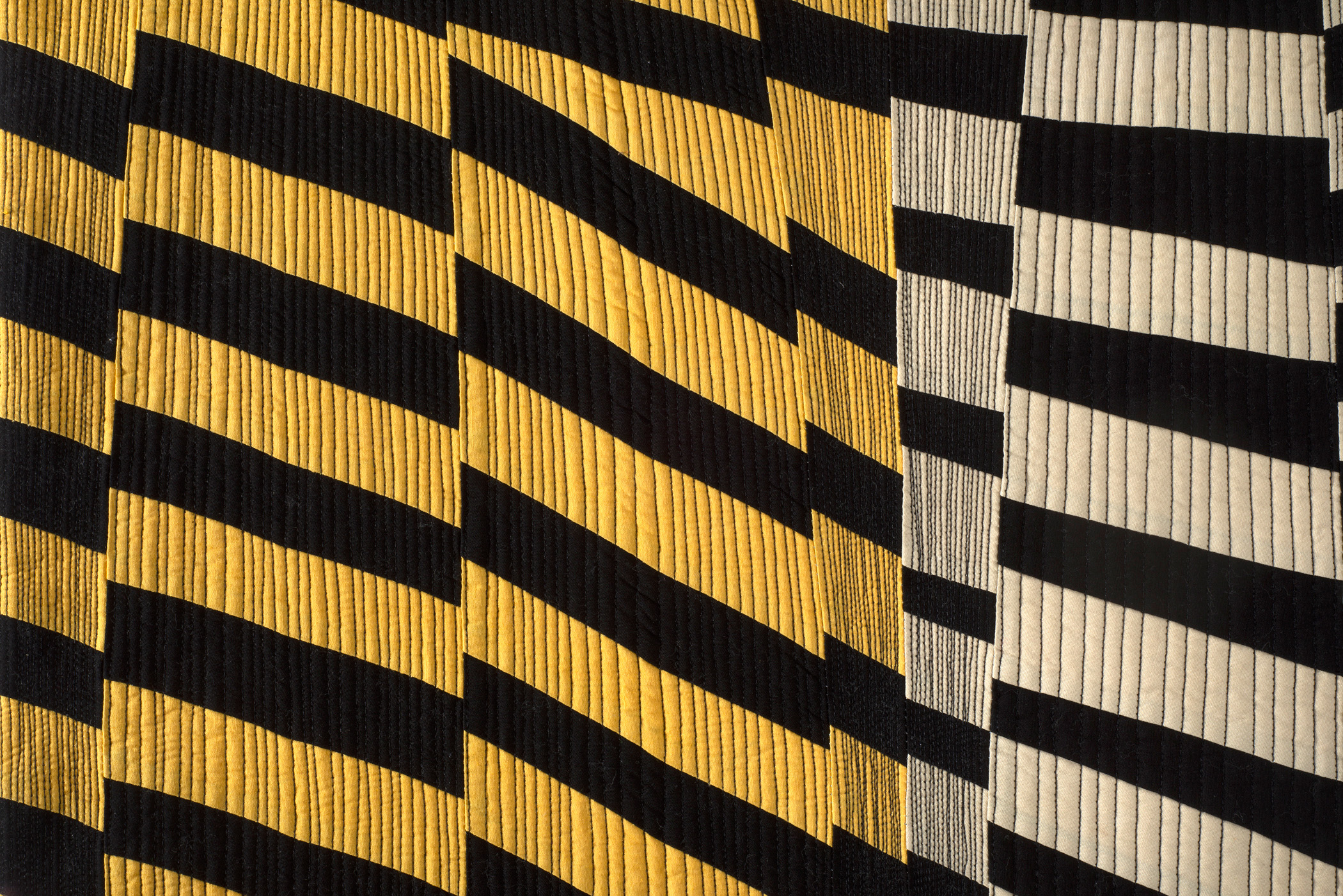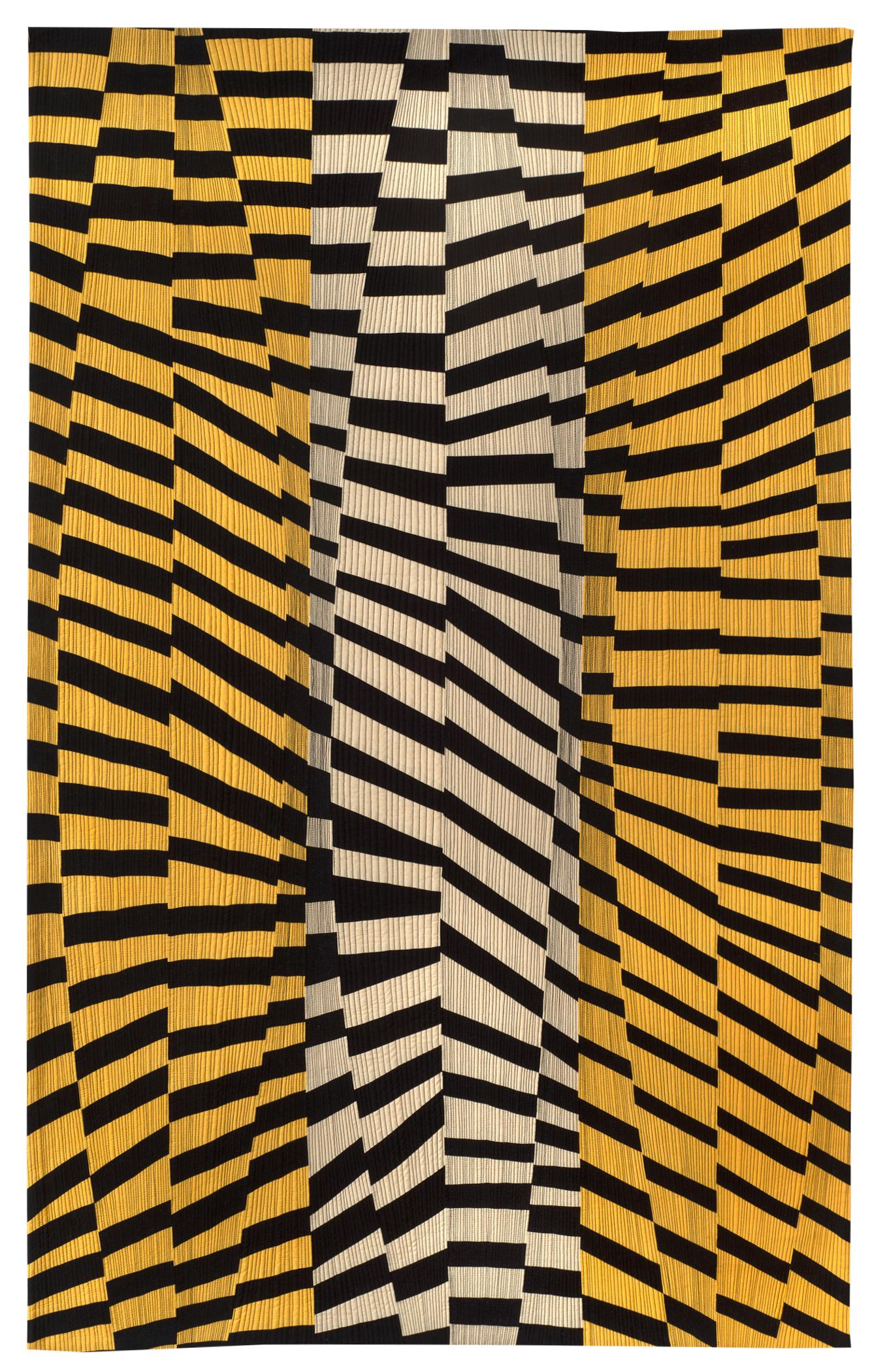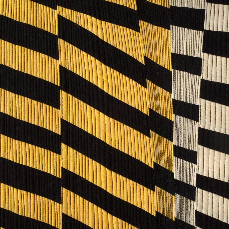 During times of turbulence and change, it is important to stay strong and centered within ourselves. I chose the word strength as a focus for the year. As I manifested strength, I grew in my ability to feel physically, emotionally, and mentally capable of moving forward in my life and artistic work. Leaning Inward #5 embodies this feeling through strong lines that create movement, tension, rhythm, and connection. The concept of growth, change, and support is created by the interaction of the arrangement of individual pieces, seamlines, and quilting lines.
