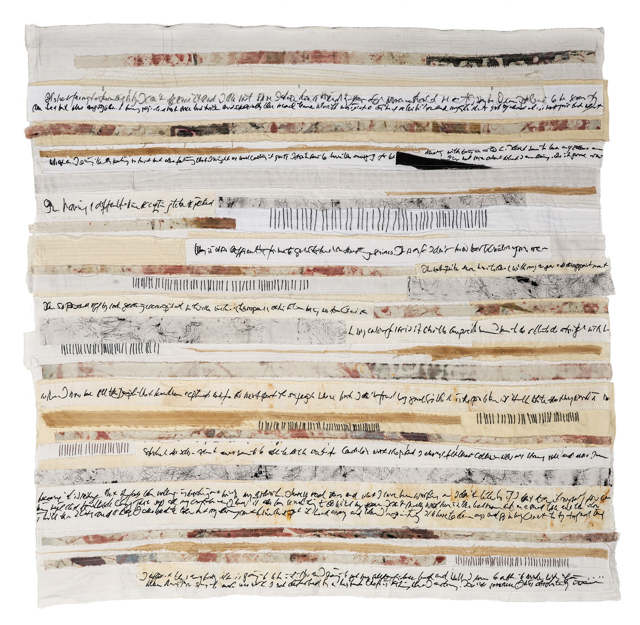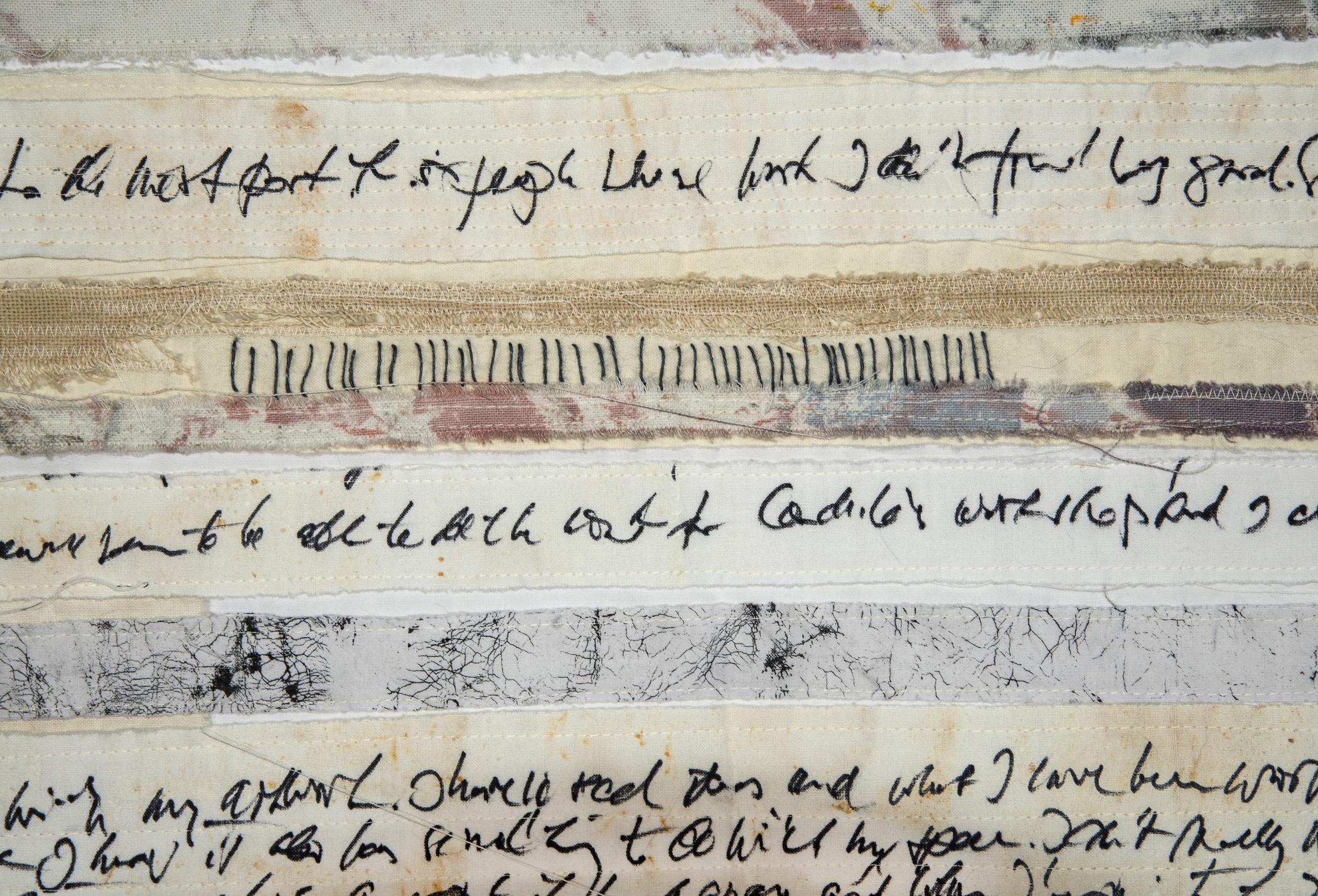 I write 3 pages every morning with a pen on paper. Later I transfer my writing onto fabrics by various means, including screen printing, painting, stamping, mono printing and writing with a syringe and a cola pen. It is not necessarily legible, but rather a symbol of communication