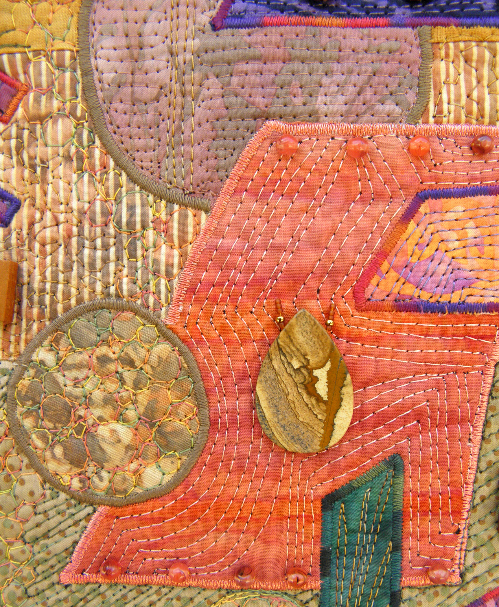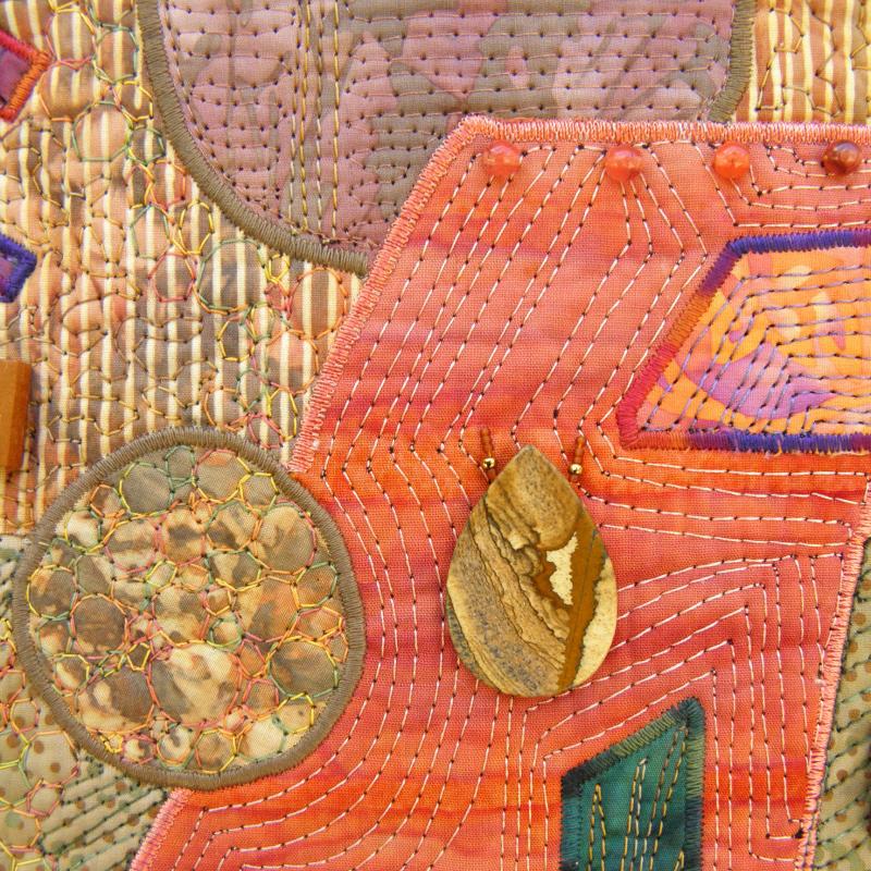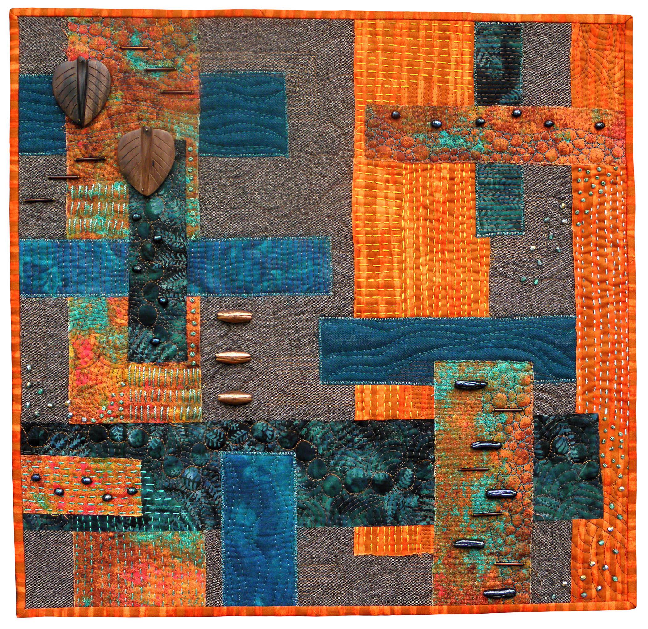 Creating a purely geometric representation of something in nature is a challenge I embrace with my artwork. I love communicating my respect for the natural world using cloth, stitching, and embellishment. The choices of colors, textures, and compositions are used to communicate my love of the landscapes, happenings, and life found in my backyard. It is my goal to use my abstract art to share my passion for what I see and feel with other people and allow them to experience something for themselves.
