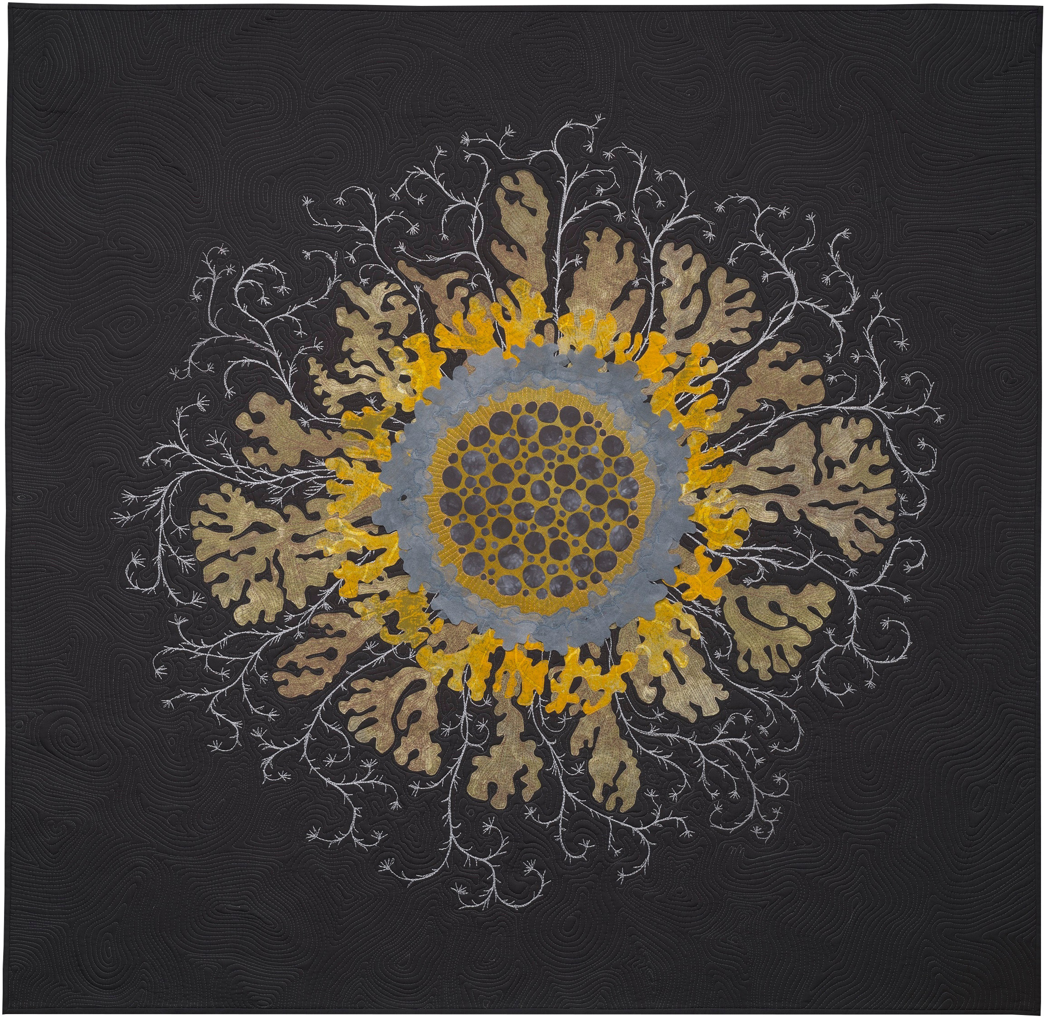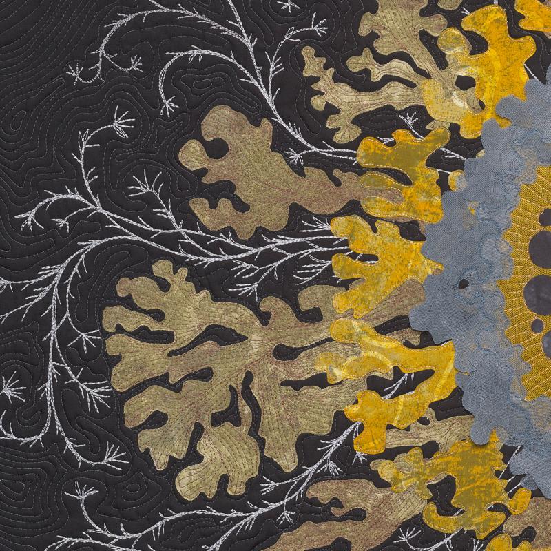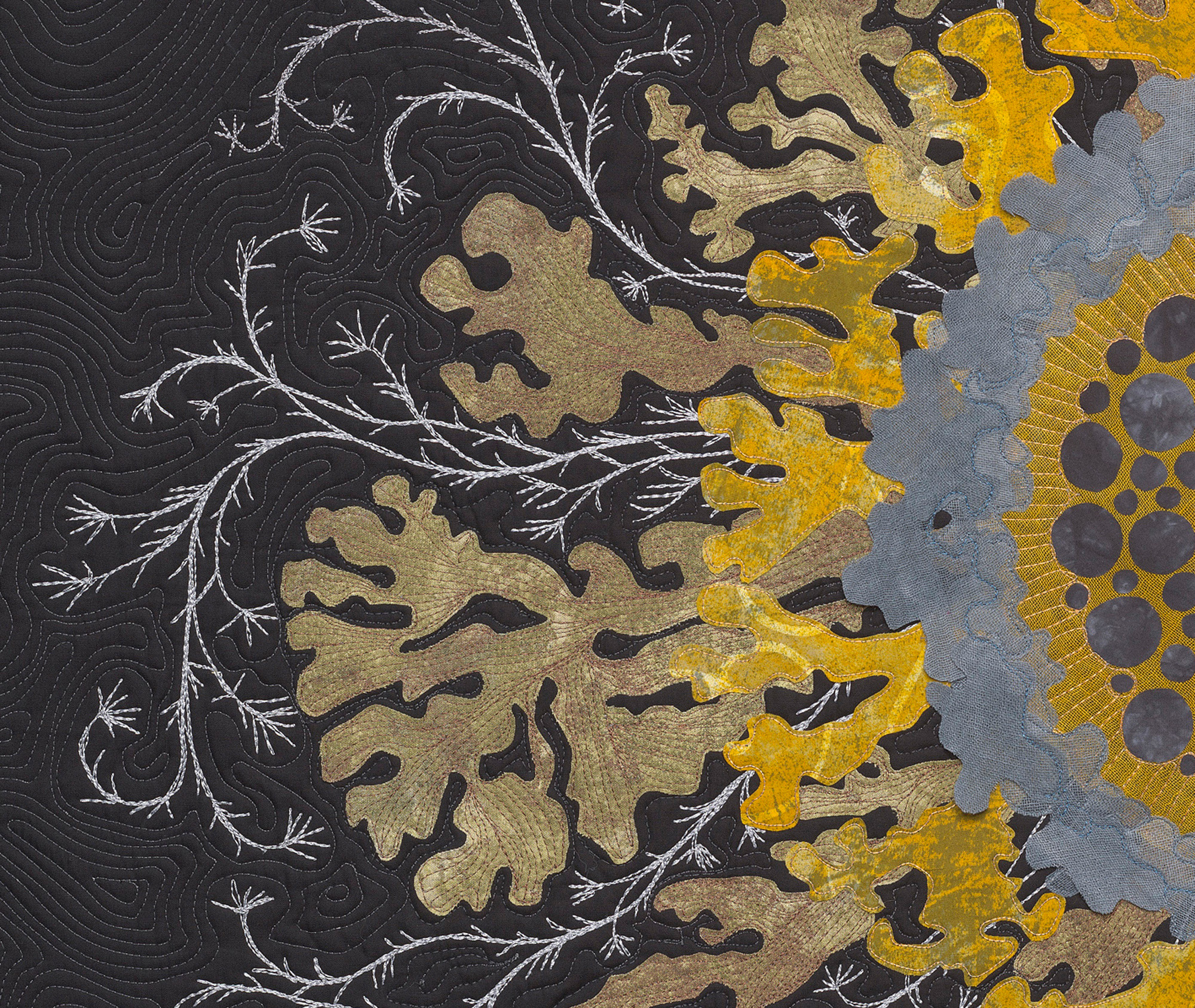 Lichen North connects 50 years of wilderness explorations to my fascination with how art and science relate. Out in the country, at the pace of my feet or my paddle, I see small things and record them in sketches and thousands of photos. I study my tiny friends with botanical keys and monographs, relating my sketches and photos to scientific drawings, especially Ernst Haeckel’s work. Plant and cell forms are drawn and traced in various sizes to proportionally fit the motif I am constructing. I dye and print most of my fabrics, often using experimental patterns and color combinations. Heavy quilting and machine embroidery provide the finishing details.