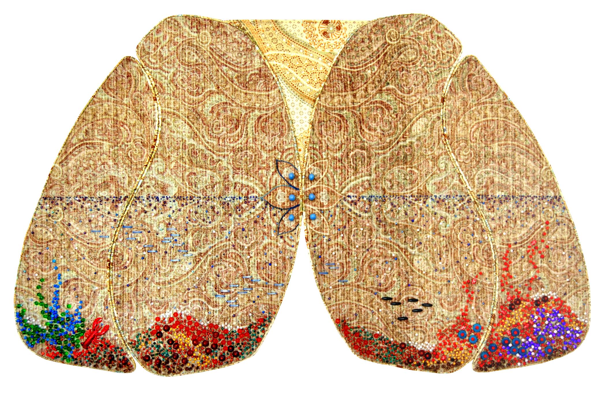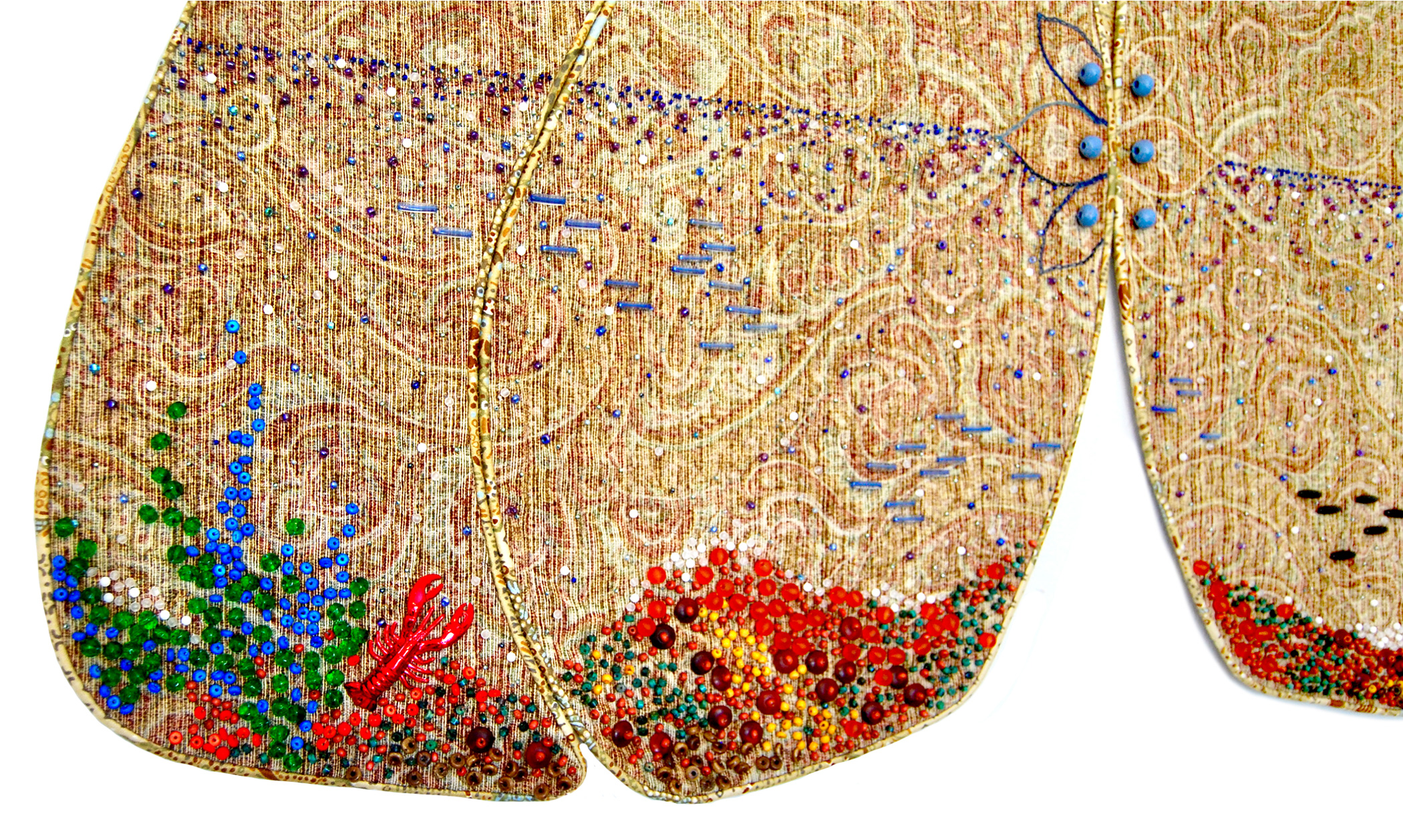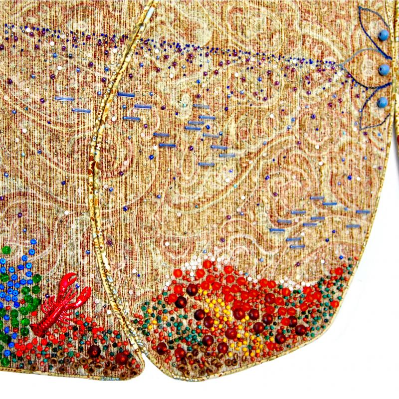 Cut, constructed, hand stitched, machine quilted, hand beaded, hand embroidered