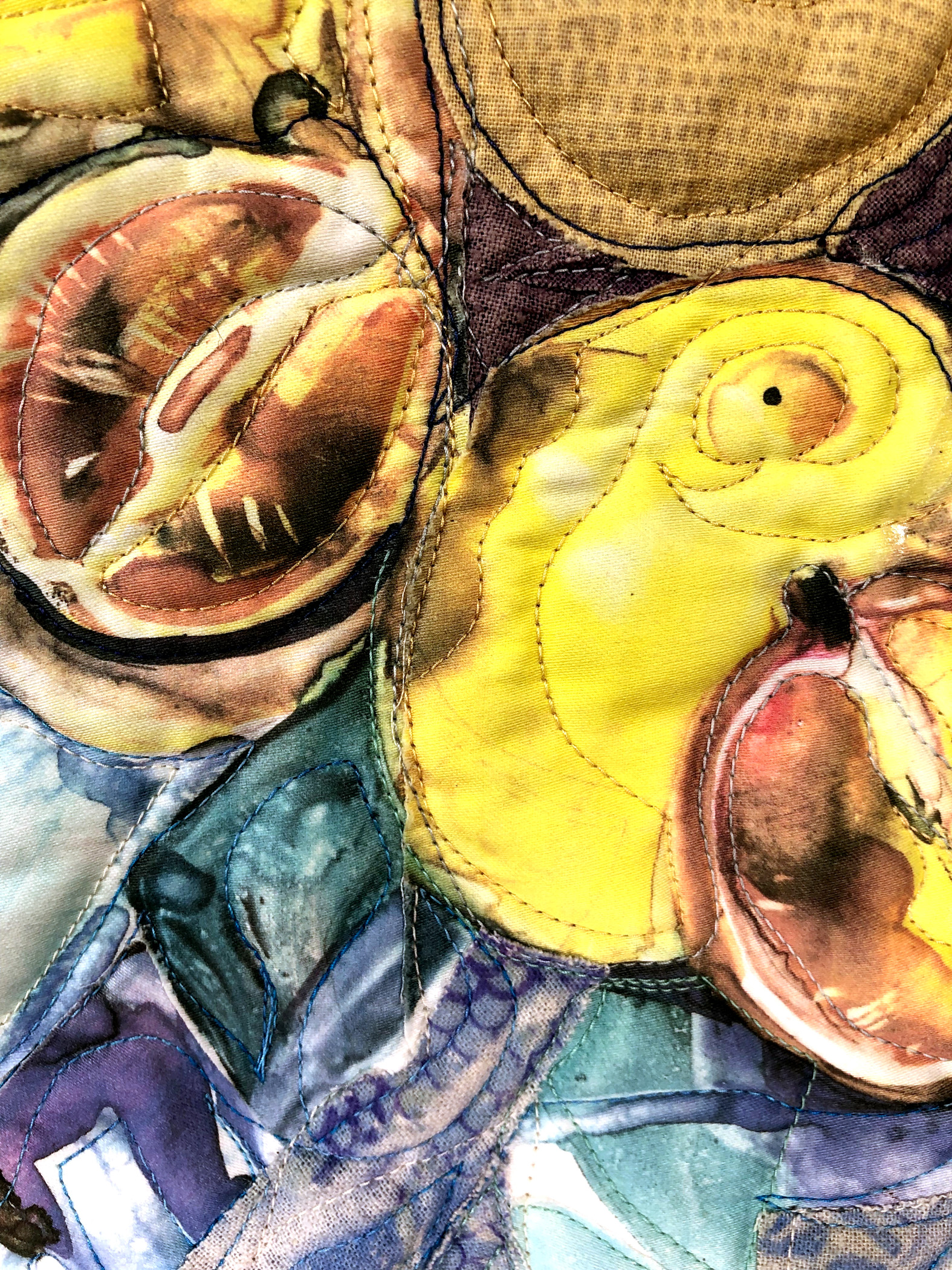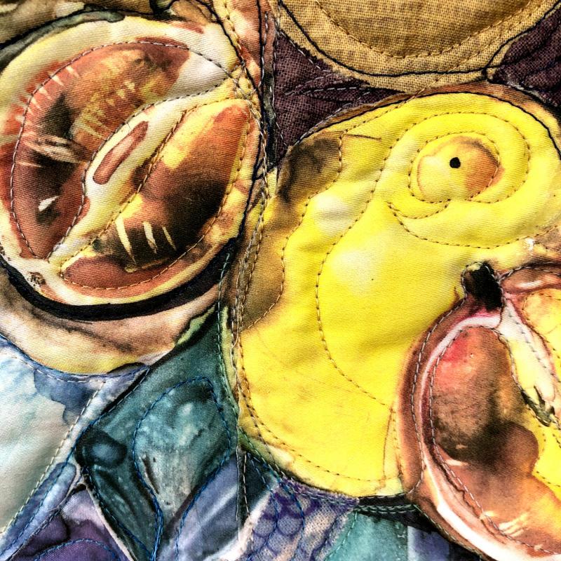Digitally printed, naturally dyed, tie transferred on silk, appliquéd, free motion quilted