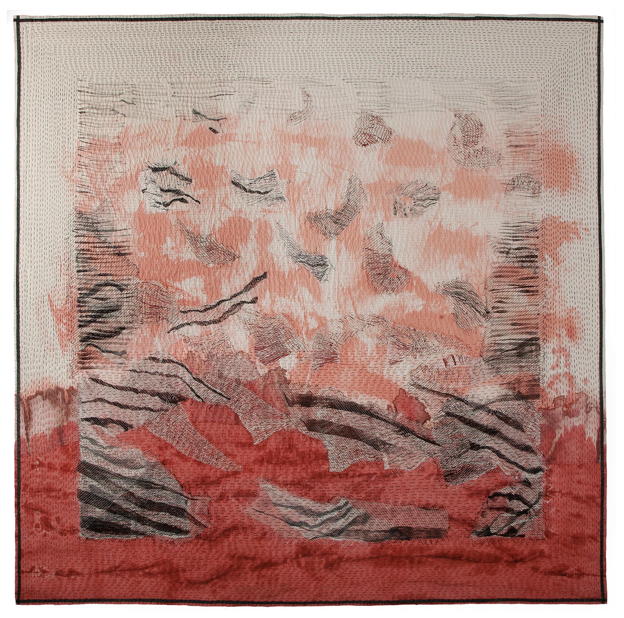 Pleated, painted, collaged, mostly hand stitched throughout.