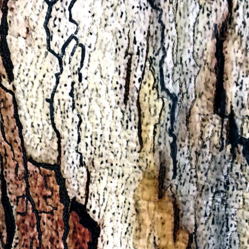 Line Dance: Tree Ring Patterns, var. 25 is an interpretation of a photo taken while walking and observing in the forest. The forest is where I feel most at home and at peace. I love to walk, look, smell, touch, and just be there. I think about all that is happening below my feet, above my head, and everywhere around me. Being in the forest feeds my soul as well as my eyes. This interpretation from a photo of a tree stump is about the passage of time,