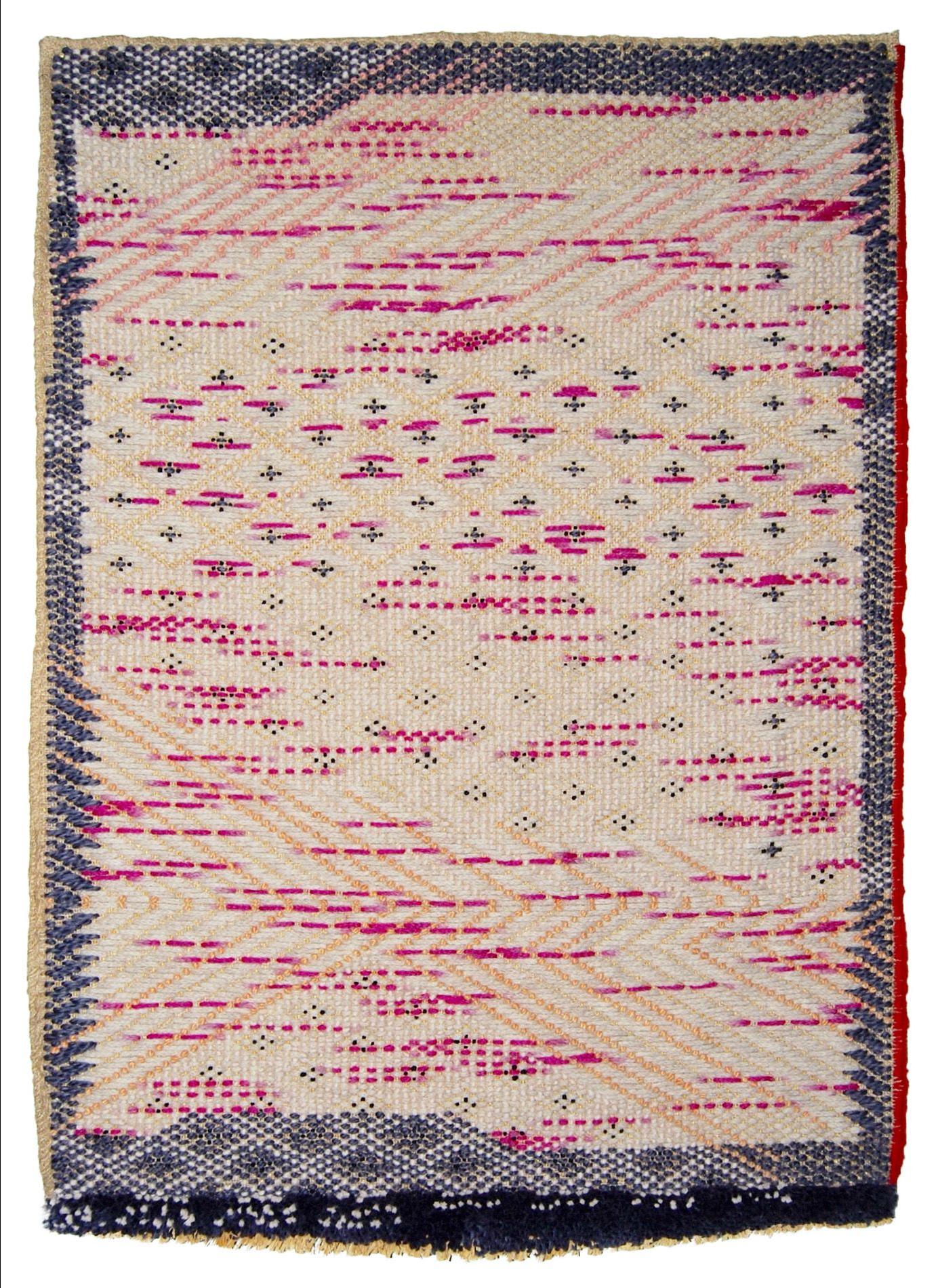 Utilizing basic plain weave and counting stitches, linear and geometric forms were created. I find the process and results akin to nature. Whether looking at a snowflake or at wildflowers blanketing a prairie, there is always a congruent form or pattern. Today, our natural environment and conservation are inseparable topics. The mixed materials used in this piece, from fine wool to common raffia, challenge the notions of value. “Use once and toss” is sadly too familiar. An item has worth when we choose to hold onto it and use it responsibly.