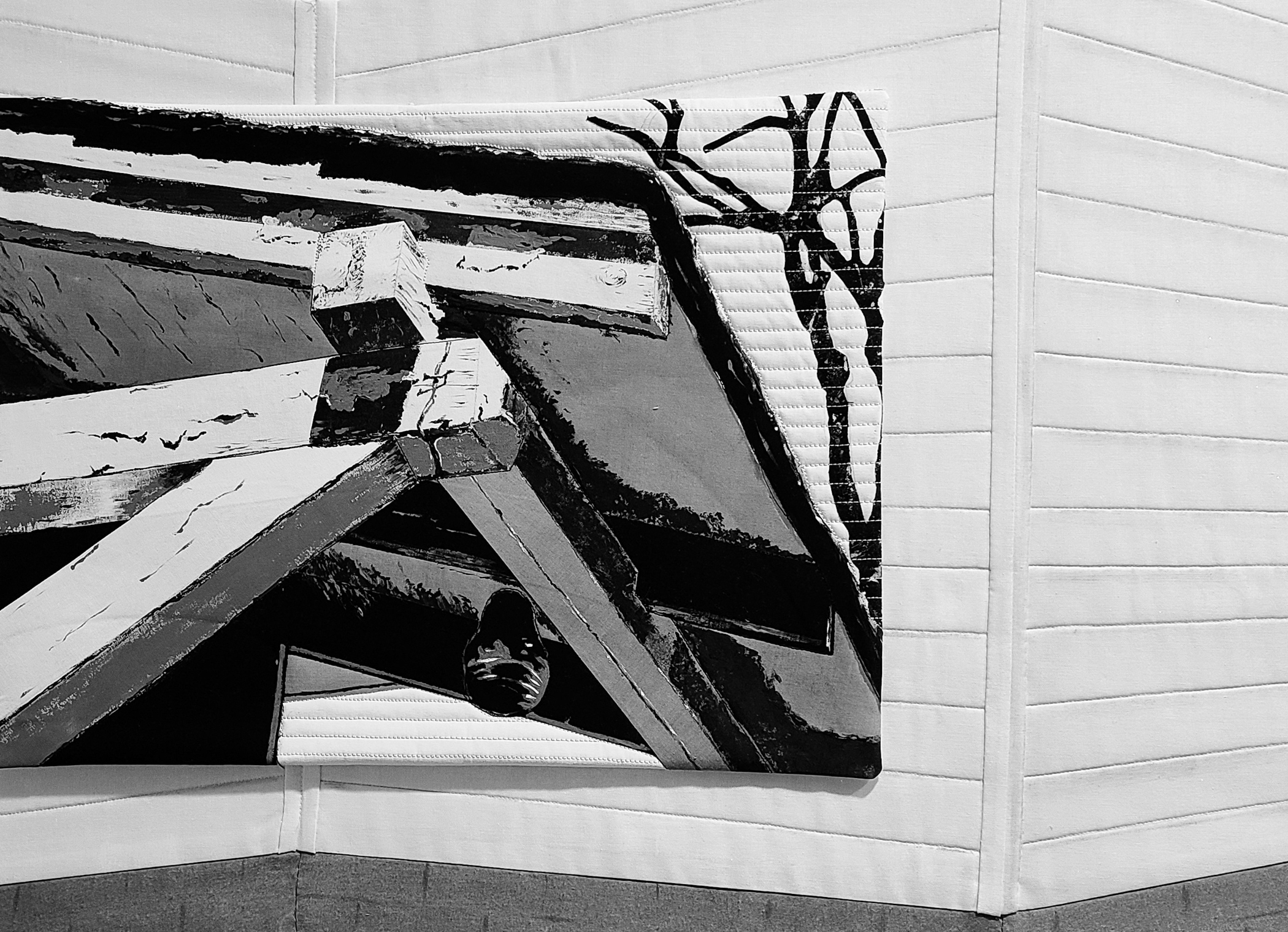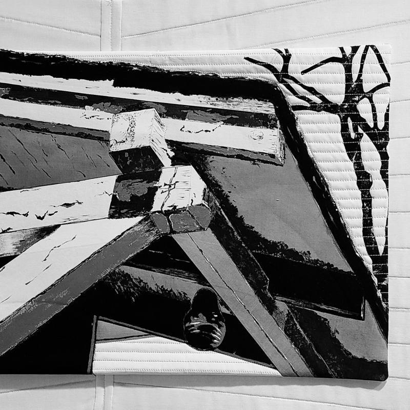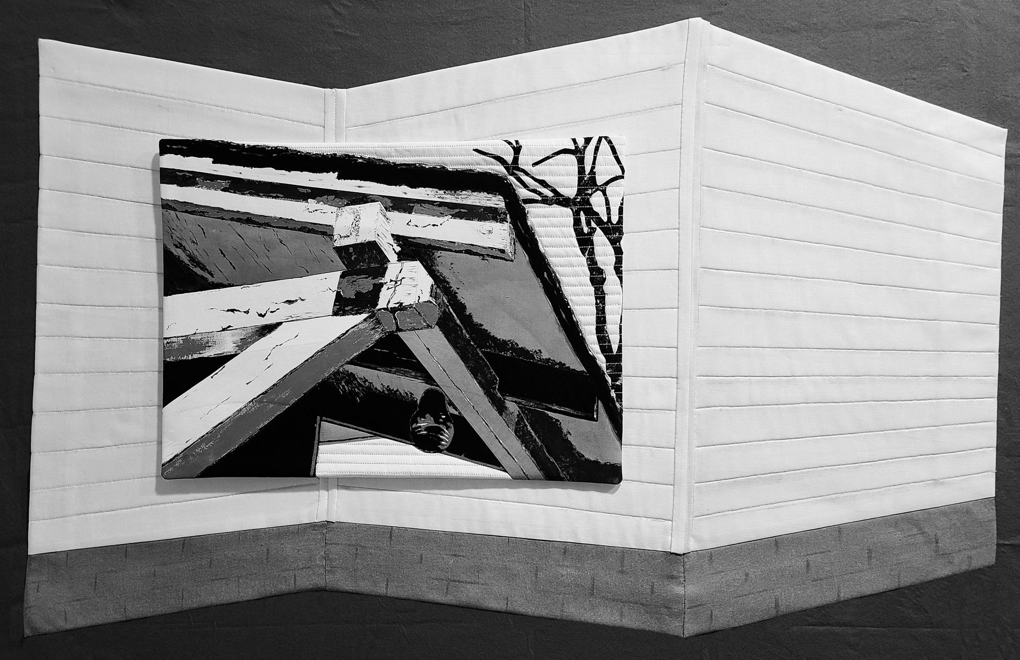 I had the good fortune to visit my childhood home in South Dakota days before it was to be torn down. My family built a new home in 1953 and this little house was moved to a nearby farm where it continued to be home to neighbors for 65 more years. The little roof over the door was the one detail that reminded me of "home" and touched my heart. The back quilt shows the siding of the house as seen in our old photos. (It was such fun painting the shadows and cracked paint.)