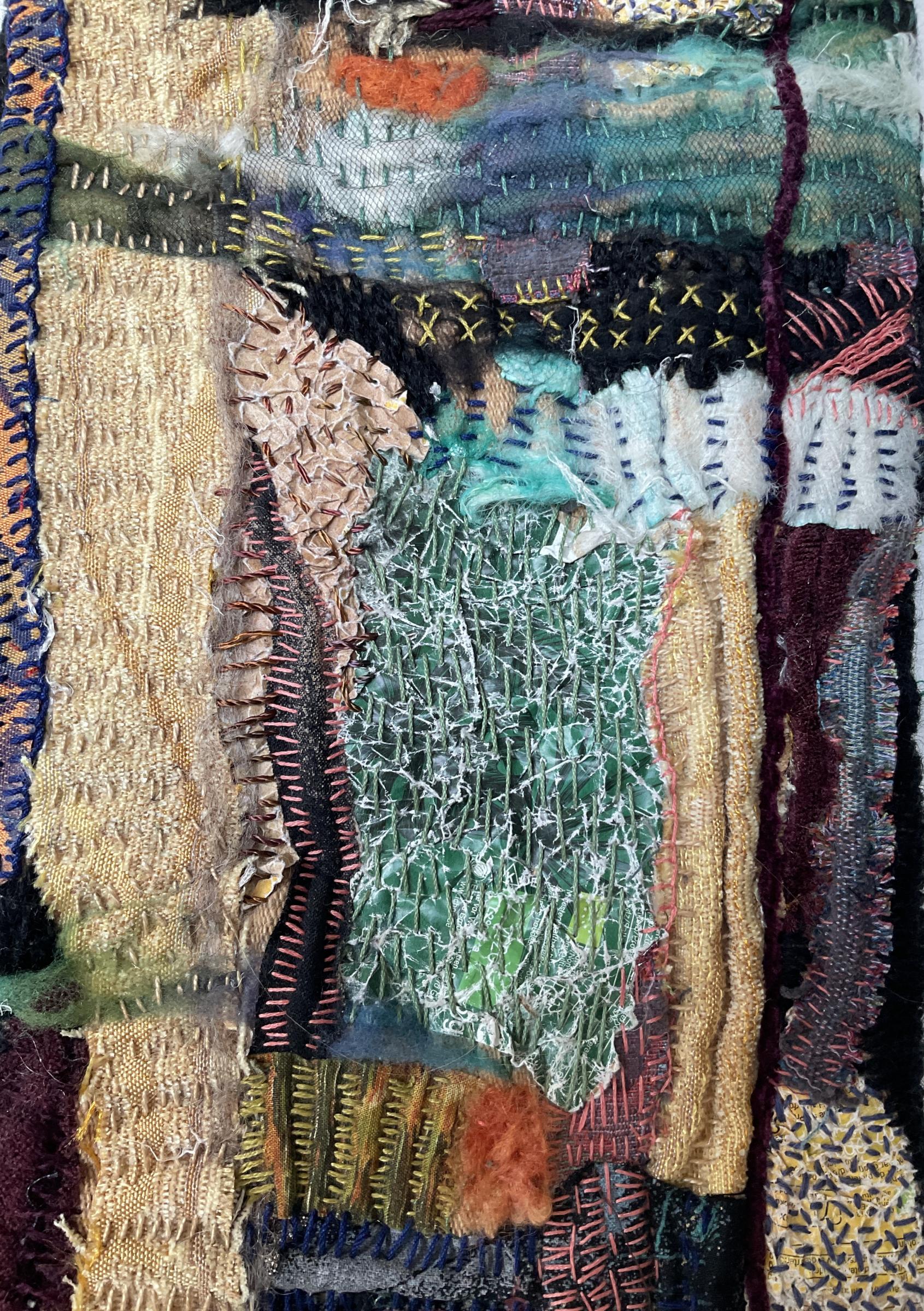 Hand-stitched with various threads on the background, fixing the fabric and paper scraps together.