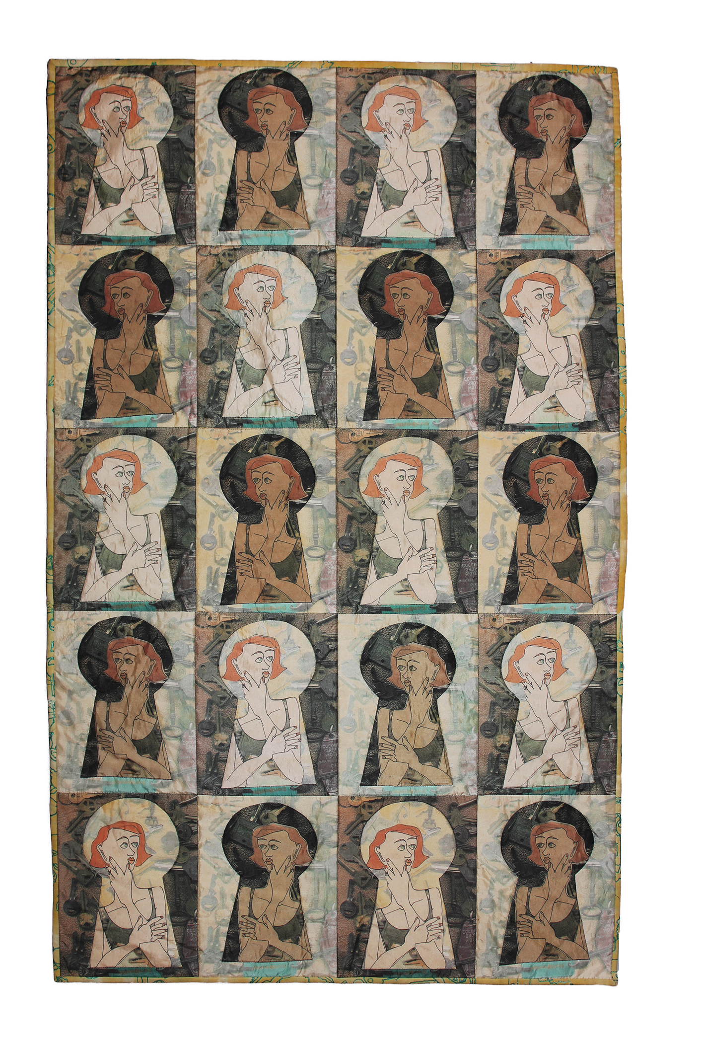 This is one of my very earliest digital collage quilts. After returning to the States after taking my City and Guilds, I began to experiment with working in my own way. I tried some sew first and paint after quilts and then discovered the digital fabric available from Dharma. I built this collage using keys from my collection of keys (from moving so much) and a drawing of a woman. At that point as a new working artist, I was wondering if I would be "Locked out".