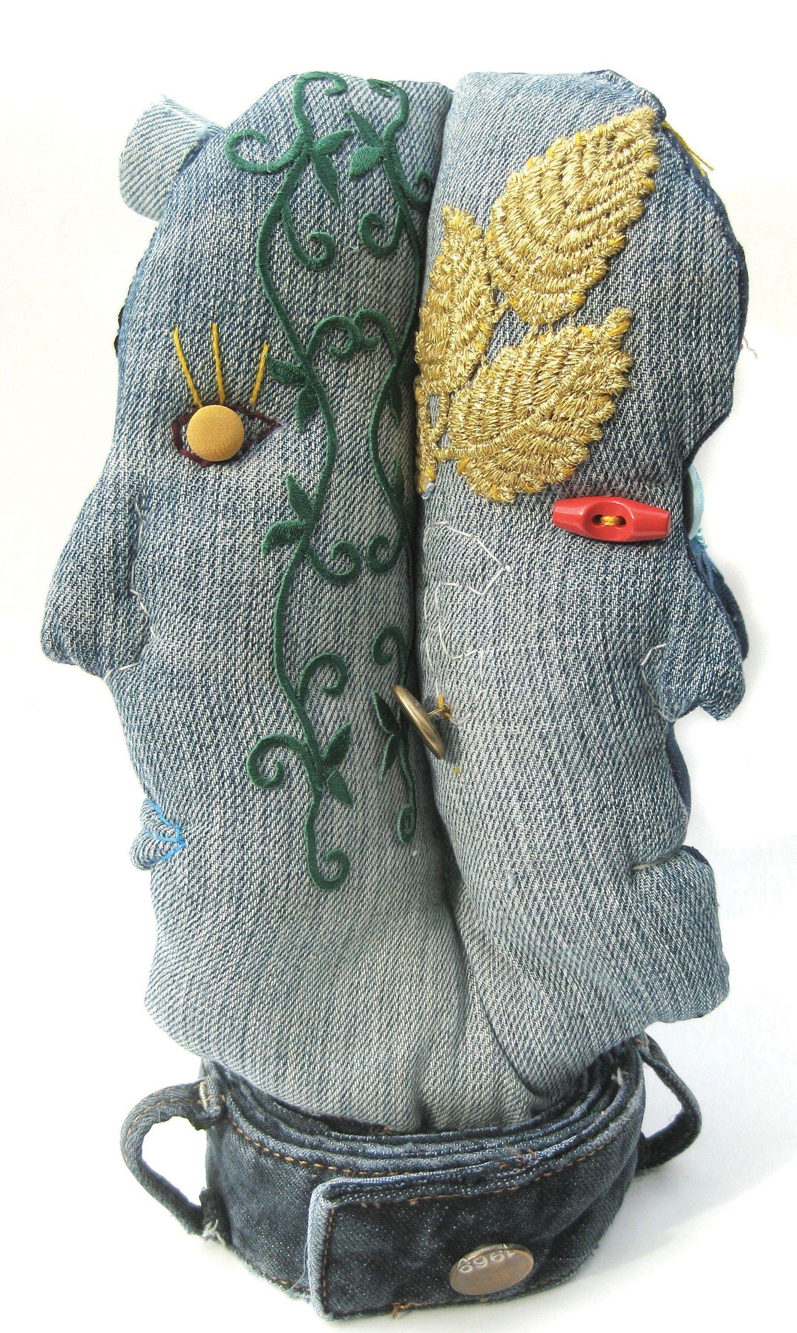This sculpture started out as used denim jeans, which I manipulated into faces and embellished with upcycled elements ranging from old clothing labels, to buttons and beads, to a zipper pull mouth. The face with a golden leaf appliqué looks like Julius Caesar to me. These statues seem to be keeping watch; they also seem to be an expression of the multiple personalities we all have within ourselves.