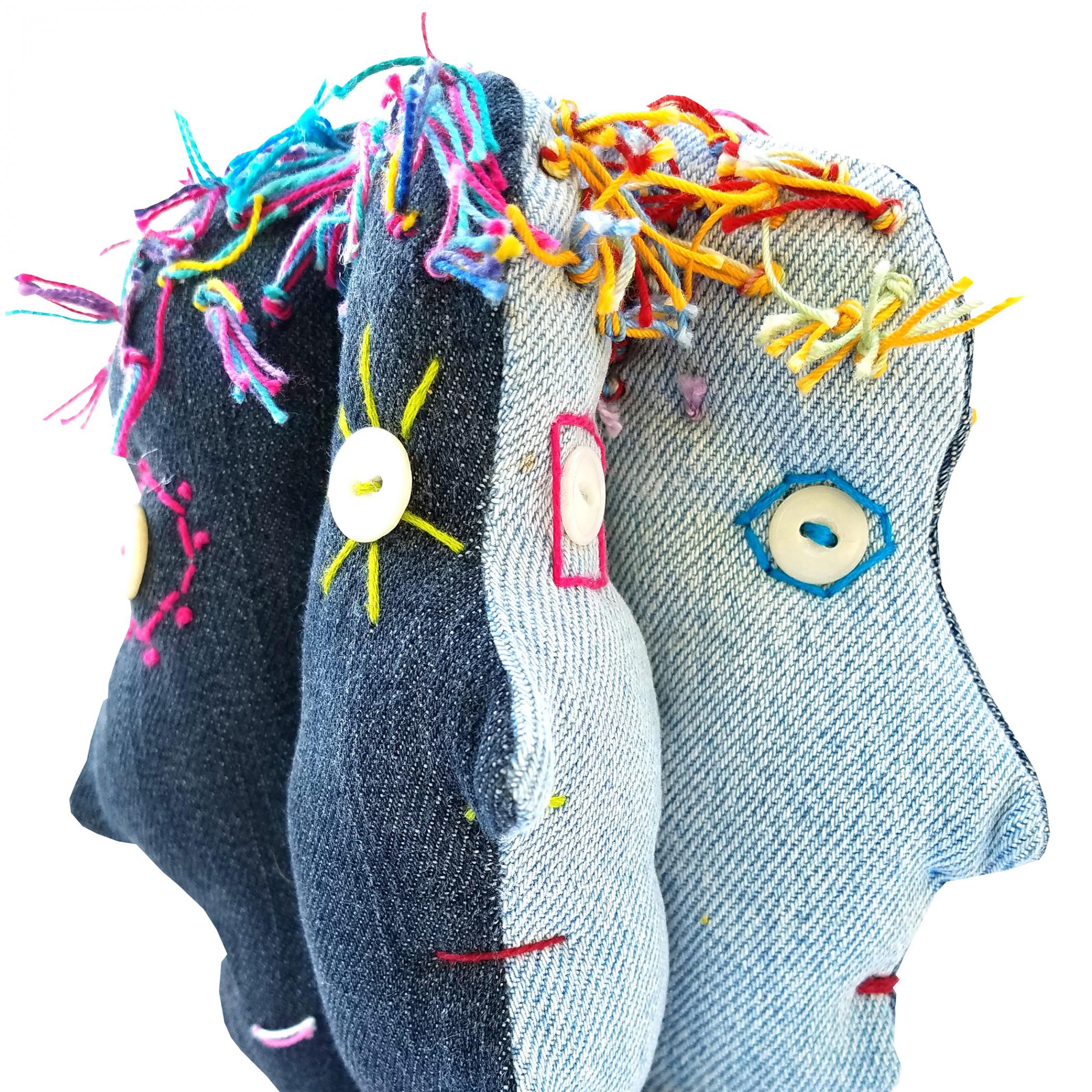 Lookouts III: Prickly Personalities is third in a series of sculptures made from used denim jeans. The faces on this sculpture seem hesitant, dubious, hopeful, and a little bewildered; young and old at the same time. Like Easter Island heads, they are wary of threats.