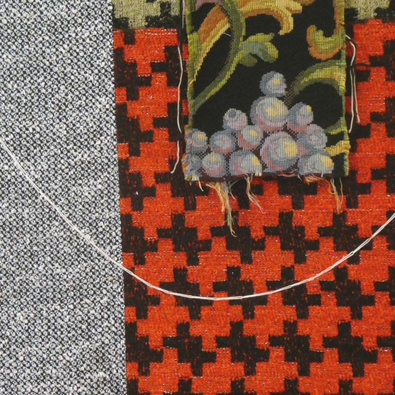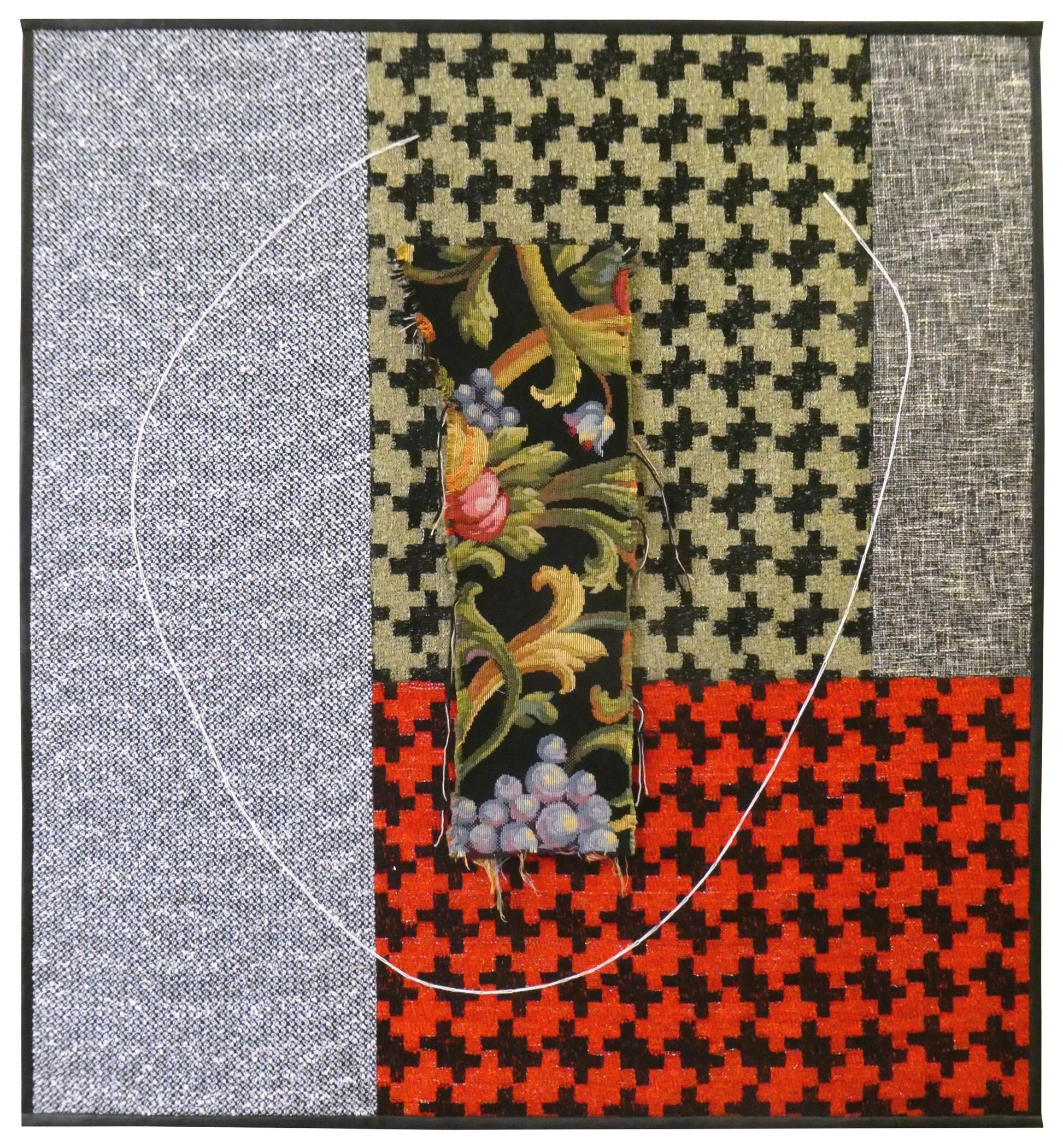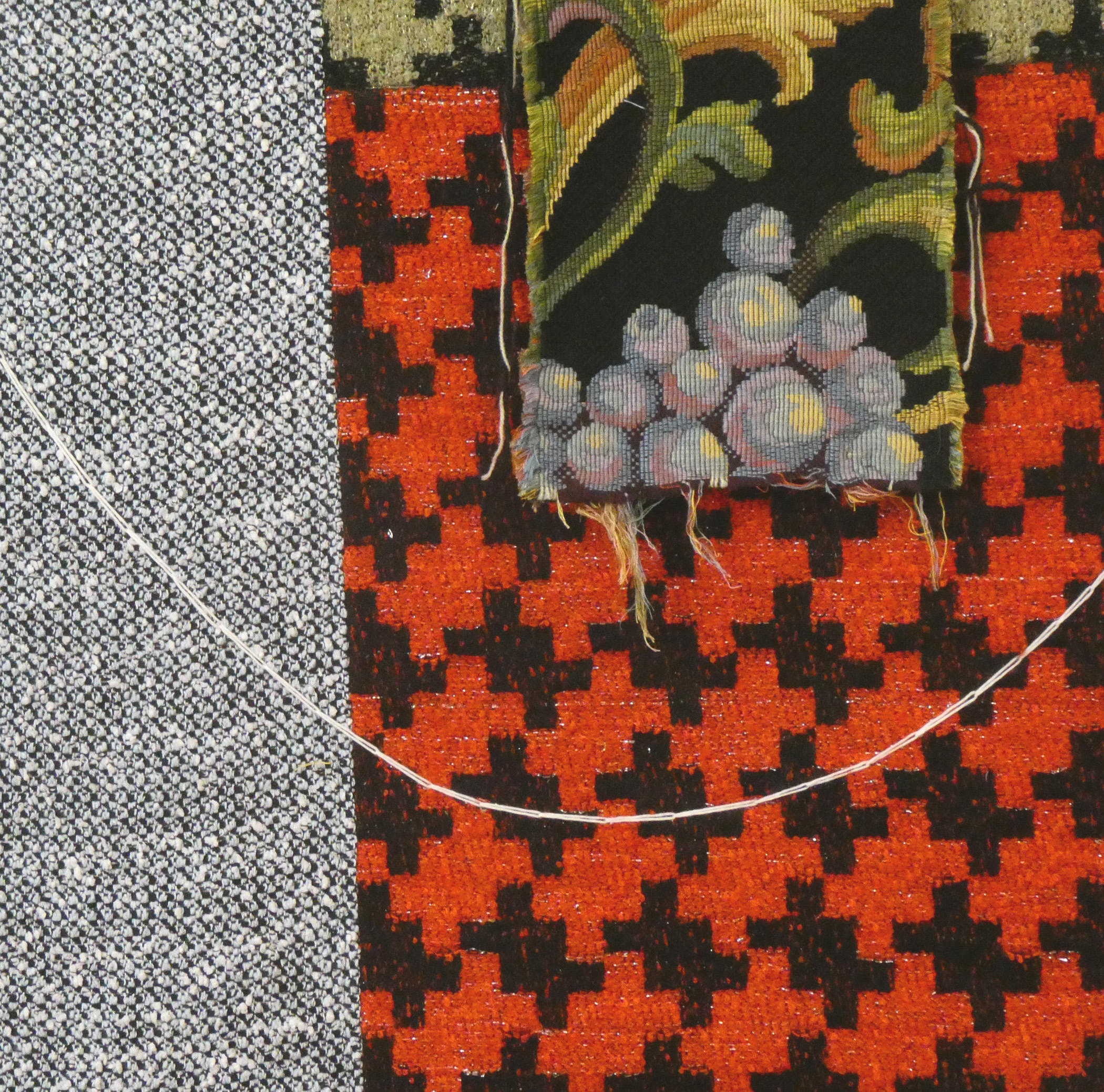 Loosely woven, wool-blended fabrics are generally excluded for quilting and piecing in favor of more tightly woven fabrics. The theme of this exhibition inspired me to use some of my cherished but often overlooked stock. A fraying found object provided a focal point, adding some organic form to the composition.