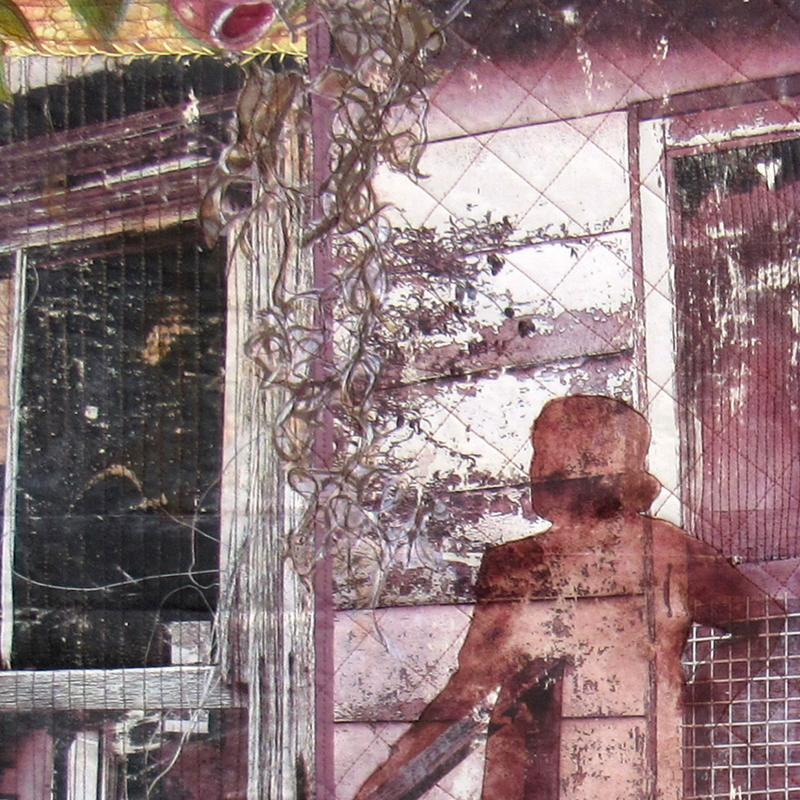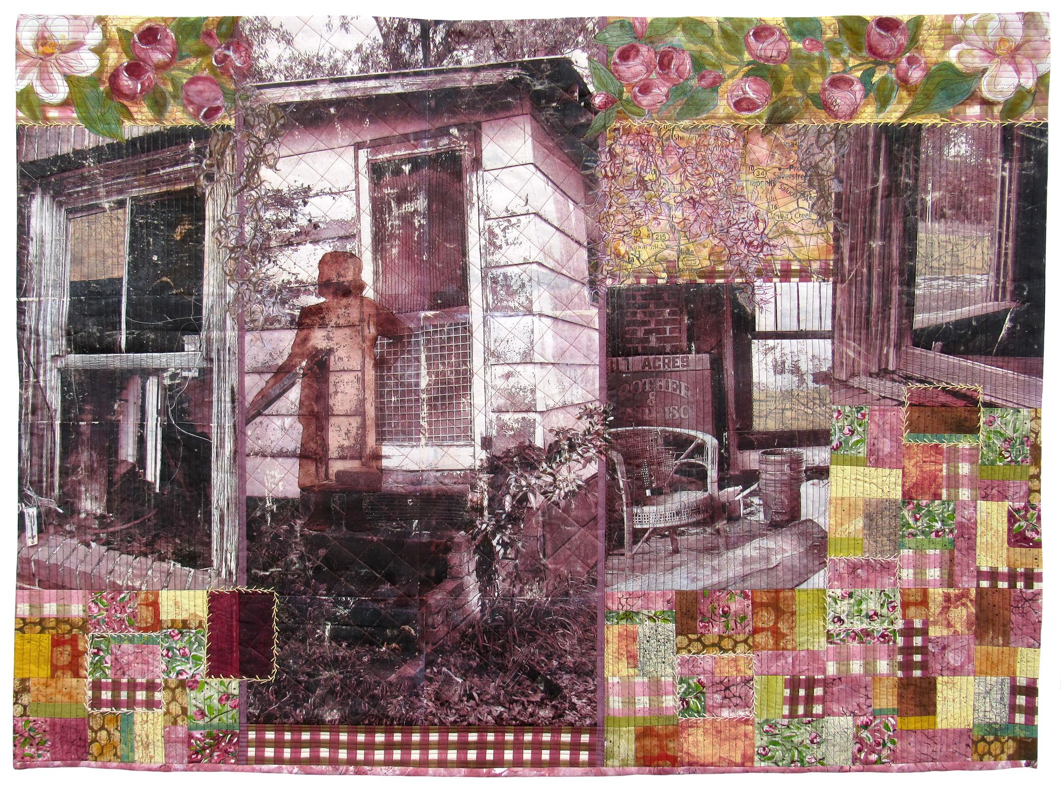 The screened back door of an abandoned home in rural South Carolina broke my heart. I walked on pine needles silently to get close to the house and photograph. I looked through windows. Then I turned the corner to the back of the house and saw the door. It opened to the kitchen. It was the heart of the home. I could imagine Gramma calling kids to supper. I could hear it swing shut and slam as kids ran through. My textile recreation of what I saw is a way to give voice to life that was there.