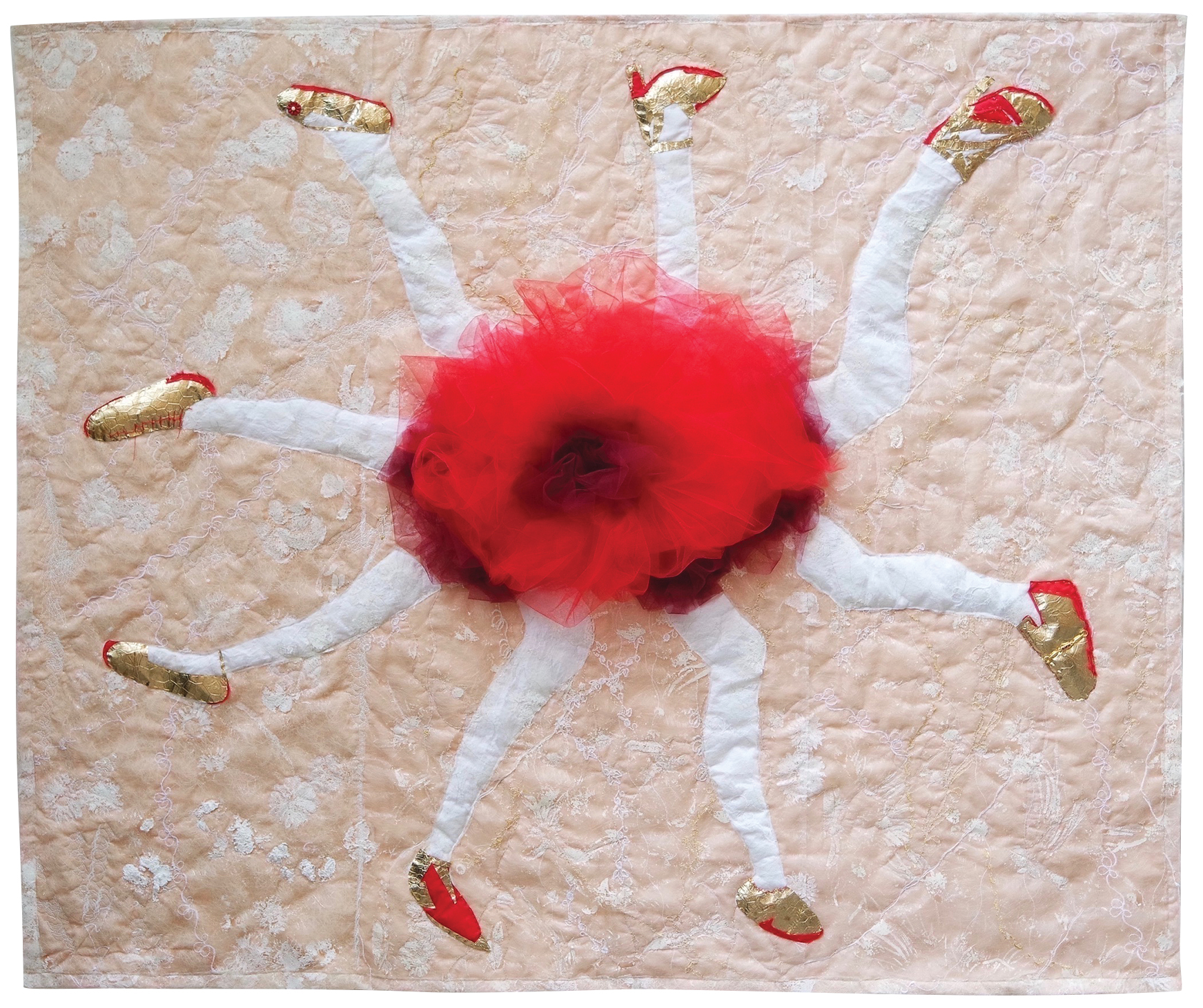 White Sizoflor, synthetic pink organza, cotton, red tulle, cotton batting, golden leather, puff paint