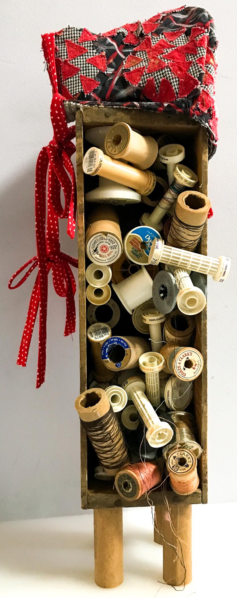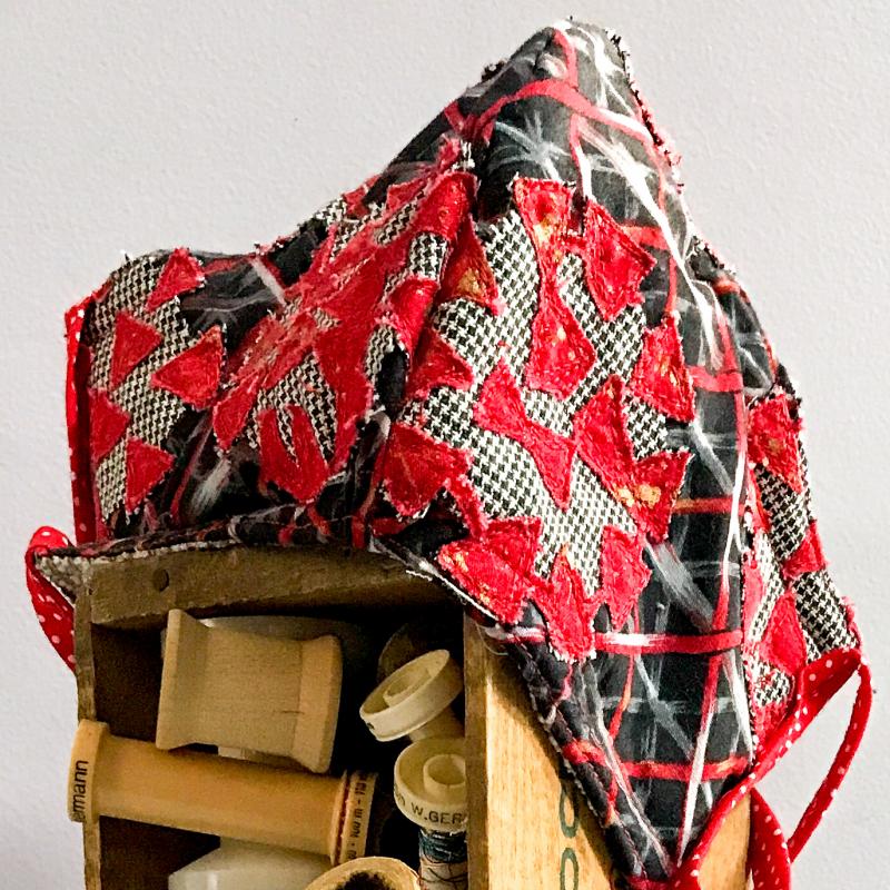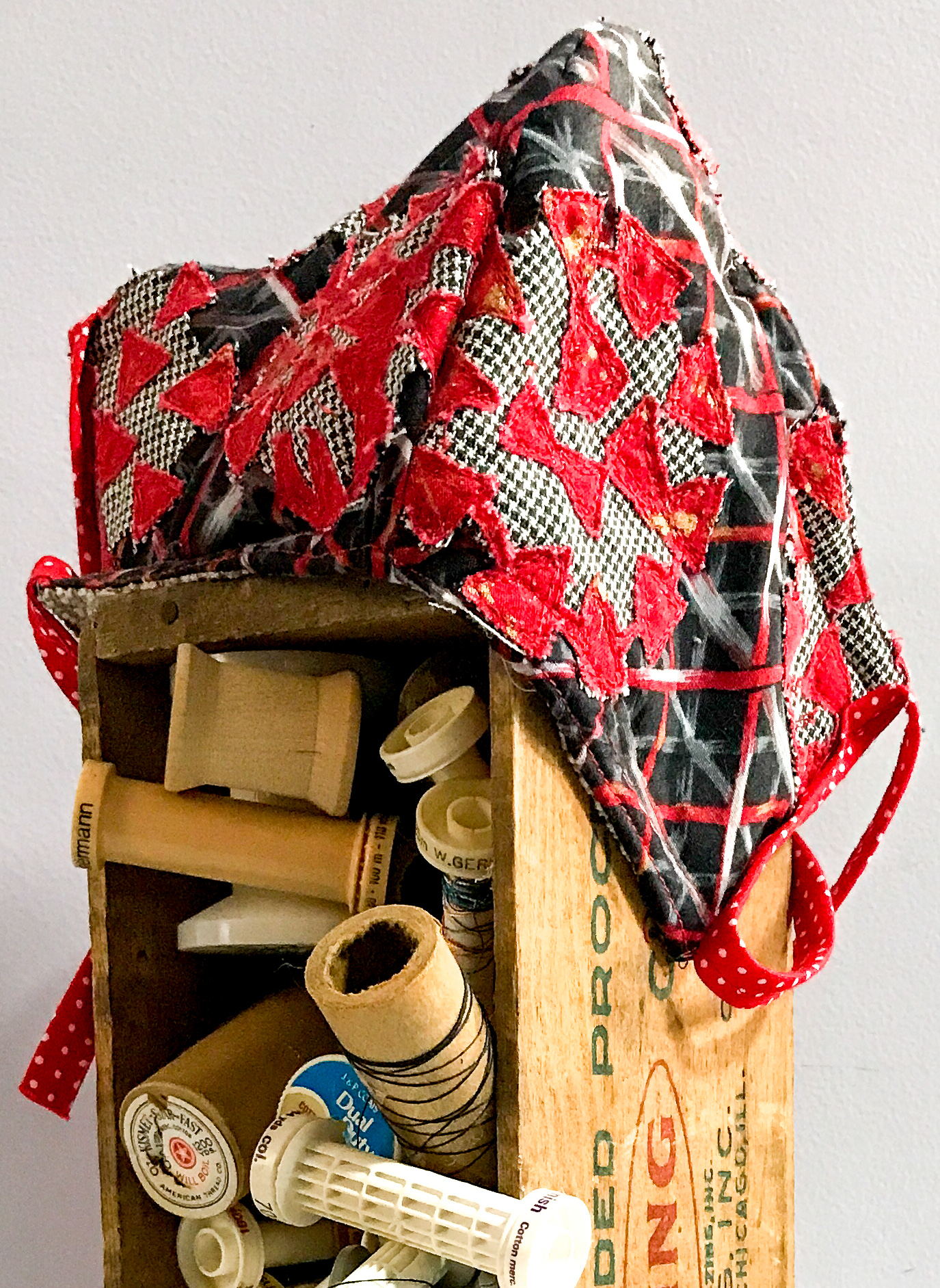This is not a quilt but made from the leftovers from making hundreds of masks during the early days of the pandemic. I felt the loss of time, loss of art, loss of life, loss of the heart of politicians, leaders, and those who only cared for themselves. I hope the simple pieces of cloth I made kept people safe. Mixed media: empty spools of thread from making masks, quilted Corona mask, old cheese box.