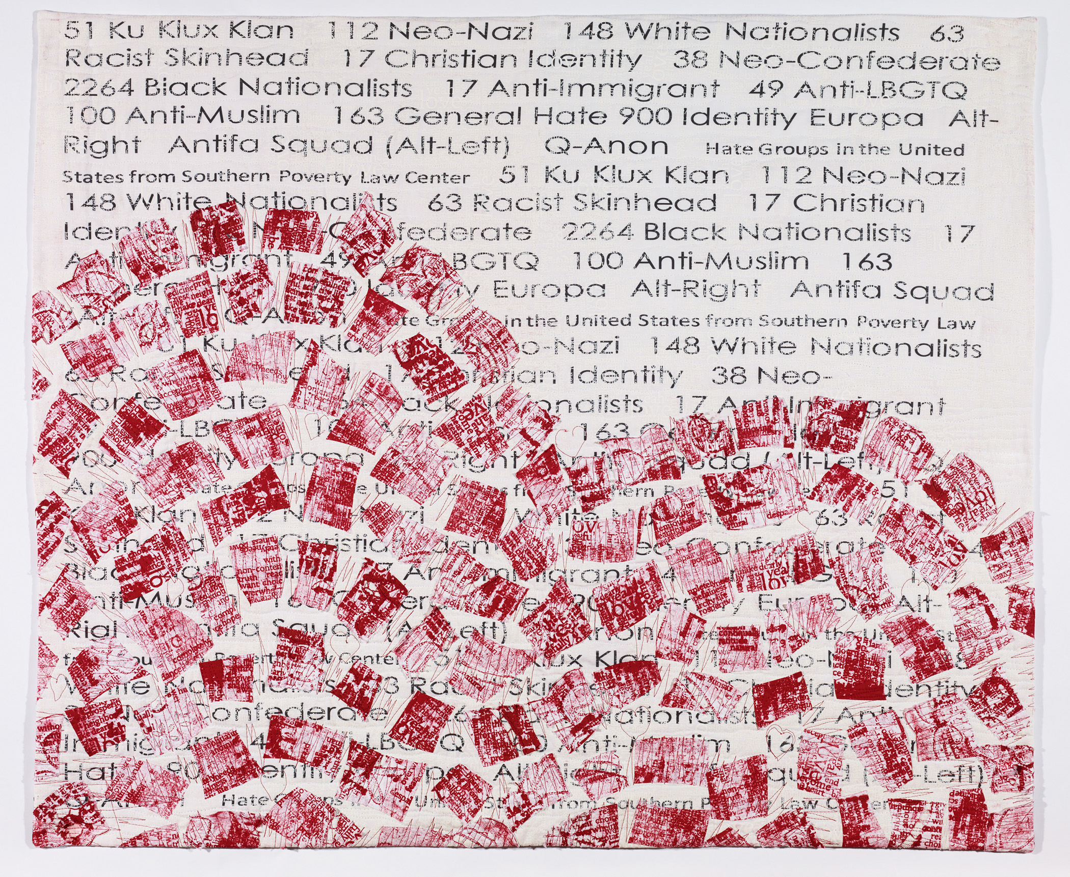 Martin Luther King Jr. said it best, "Love is the only force capable of transforming an enemy into friend." The title and quantity of US based hate groups is printed to the background. Quotes from love songs and poetry is screen-printed on top, in white and again, in red onto a vintage lace tablecloth. The mosaic of the heart covering the hate groups is my optimistic wish for our nation.