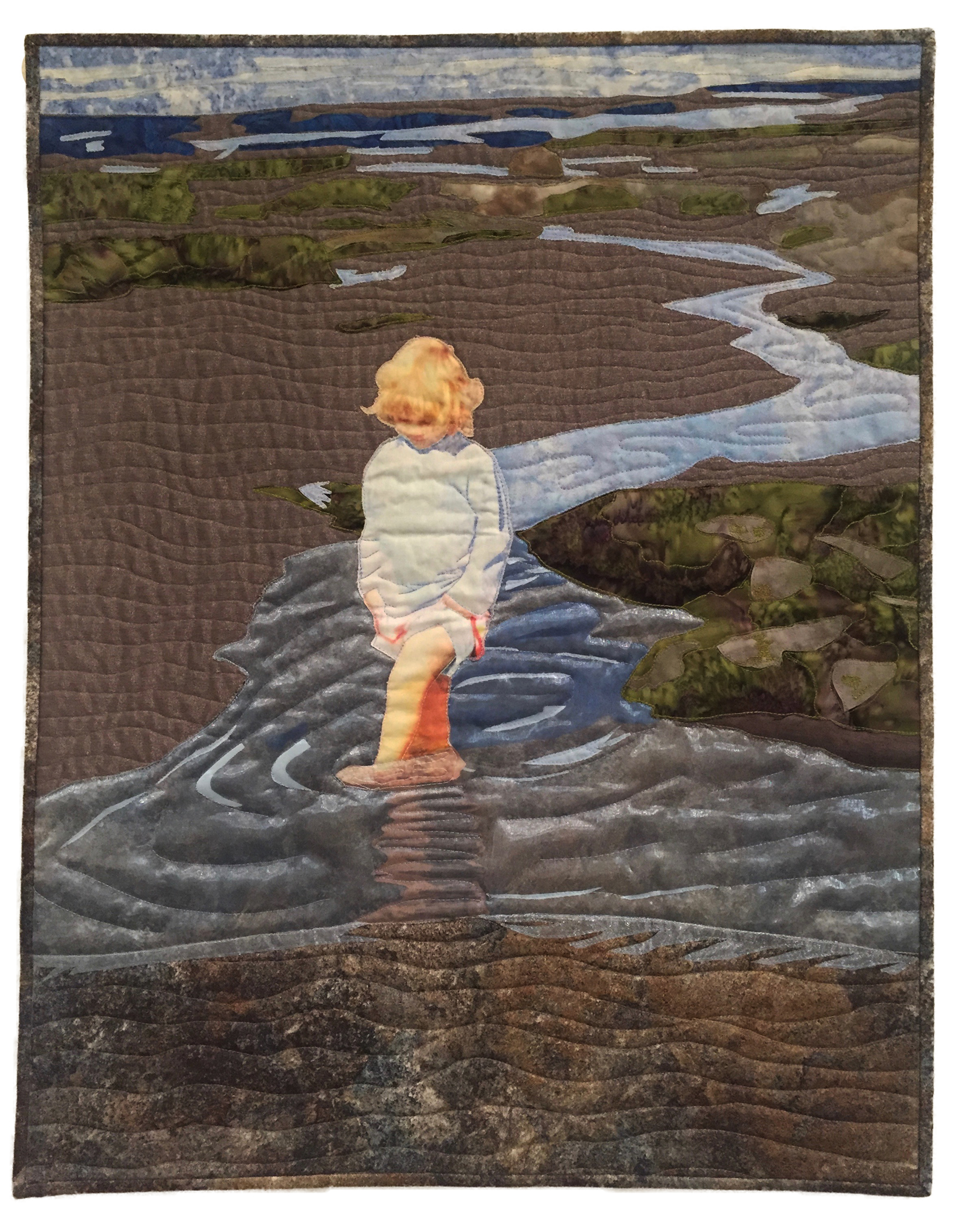 A photograph I took of my granddaughter on the Oregon coast was the inspiration. Portions of the rocks are from fabric I hand dyed and Lucy's figure is a photo transfer from the original photograph. Mauve silk emulates the wet sand look and blue organza makes the water shimmer.