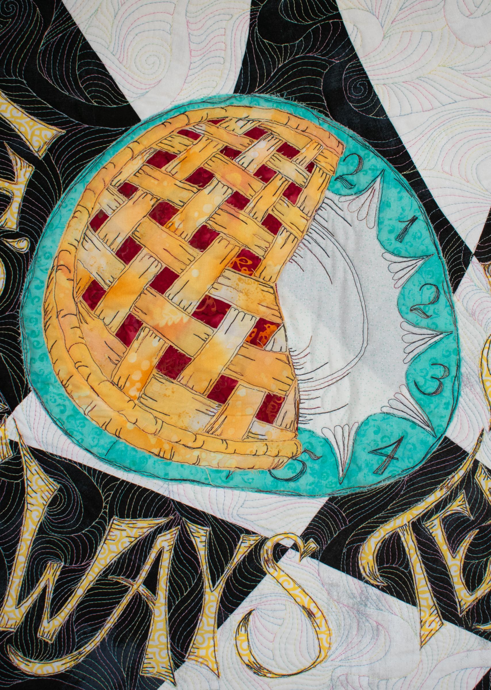 This quilt was created during Covid lockdowns - partly because I love «Alice in Wonderland», partly because the world seemed a little mad. Both of these still hold true. I wanted to create a world where nothing is what it is: are we looking at a wall or a table? are the roses white or red? are those petals? hears? biscuits? what time is it anyway? But somehow, rather than upsetting you it just makes you smile.