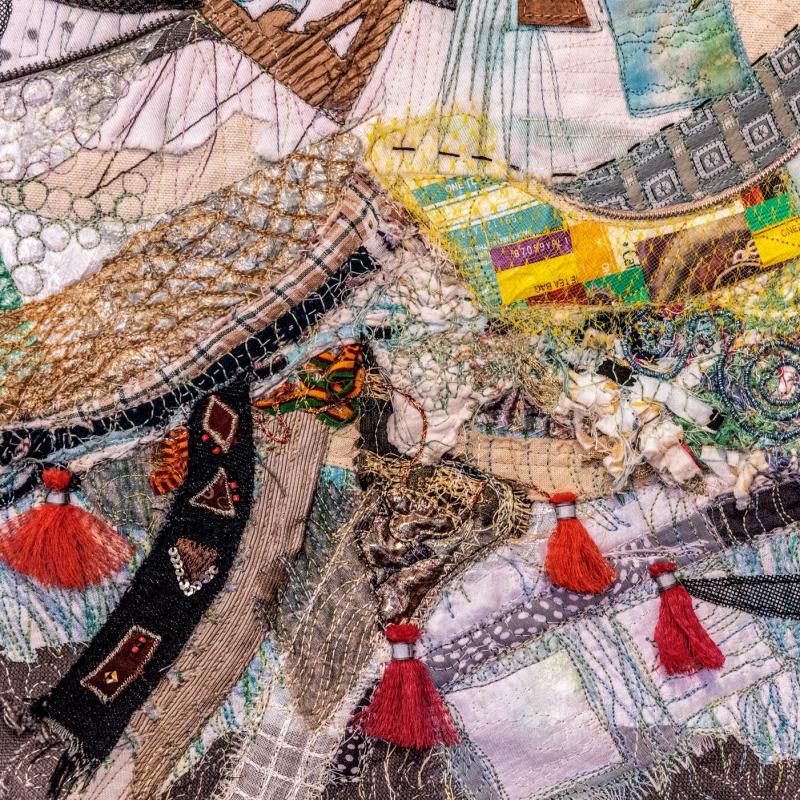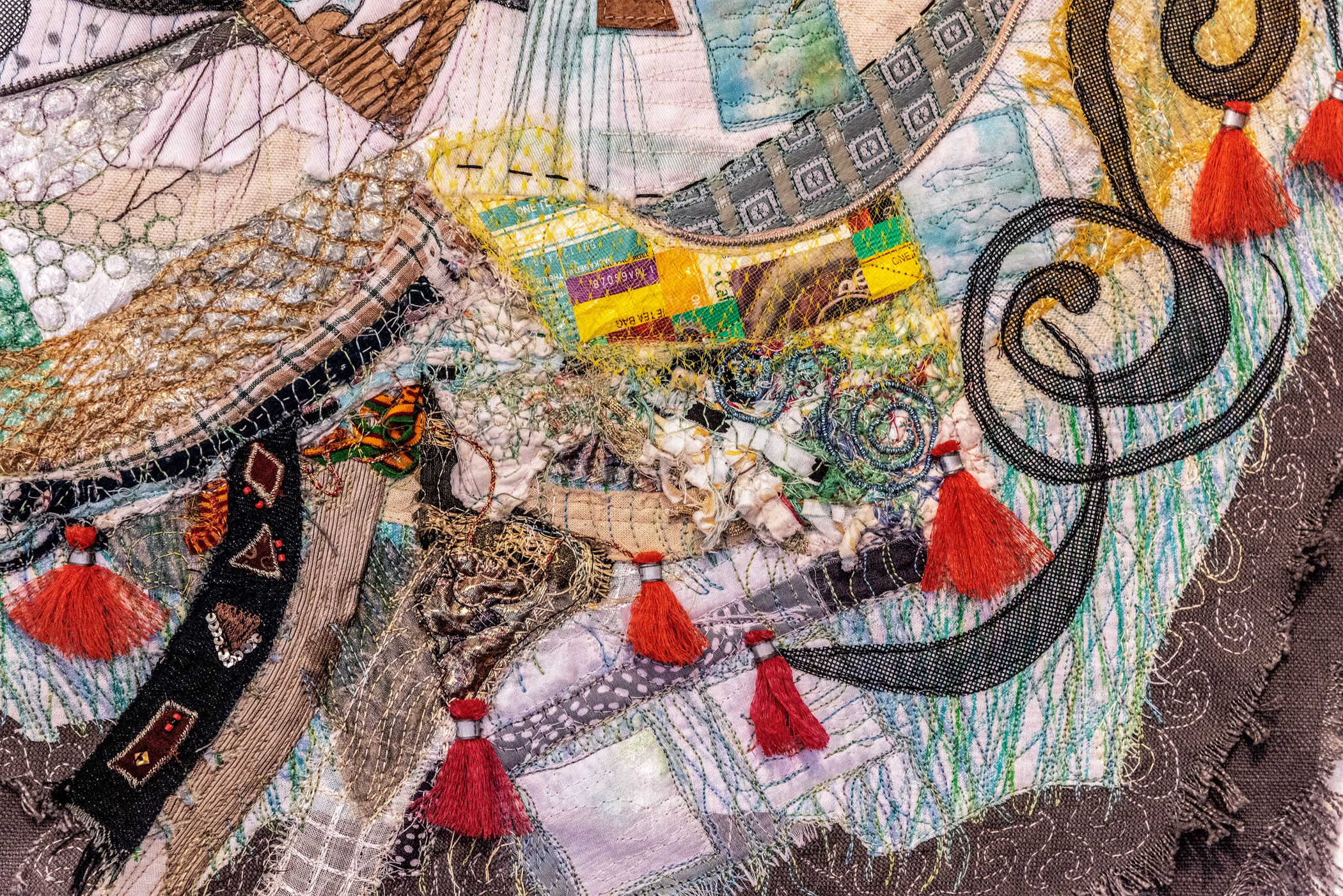 Emotional turbulence. Sturm und drang. Politicians and poseurs sucking up airtime and flooding our in-boxes. Drowning out truth, facts, and nuance. Withholding respect for the powerless and the planet. Denying the dignity of all peoples. Laboriously, I built up a torrent of my stash--and trash--onto gray canvas: plastic and mesh bags, window screening, a coffee mug sleeve, grandpa's ties, denim jeans, old zippers, dressmaker notions and trims, tea bag packaging, cheesecloth, mushroom “leather."