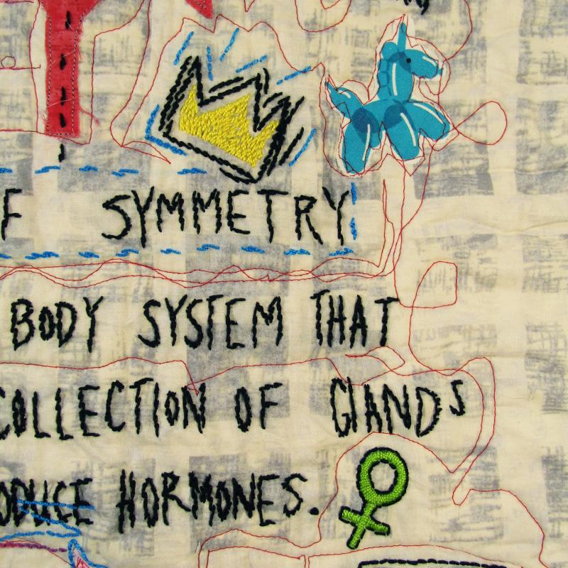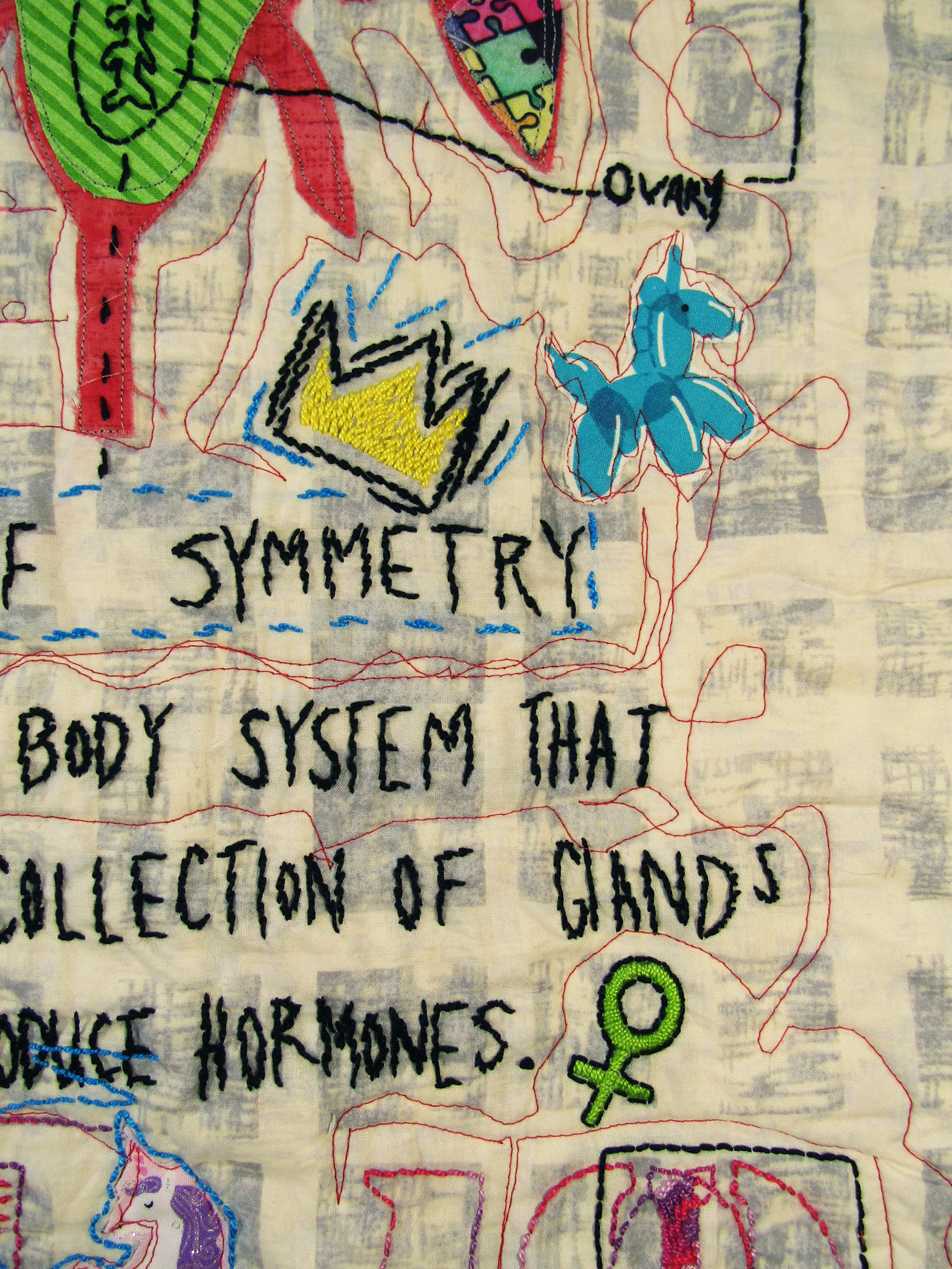 “Magical Unicorn,” is a portrait of a severely autistic girl. Autism or ASD is a disorder mostly comprised of males, she is an enigma. Basquiat influenced the style of this quilt. Basquiat’s artwork was shaped by science, from a Grey’s Anatomy book. Biologically ASD children are physically/hormonally changing but lack language. They are infants in aging bodies that still love Dora, and rainbows. While their innocence remains, it is a beautiful and heartbreaking journey to witness.
