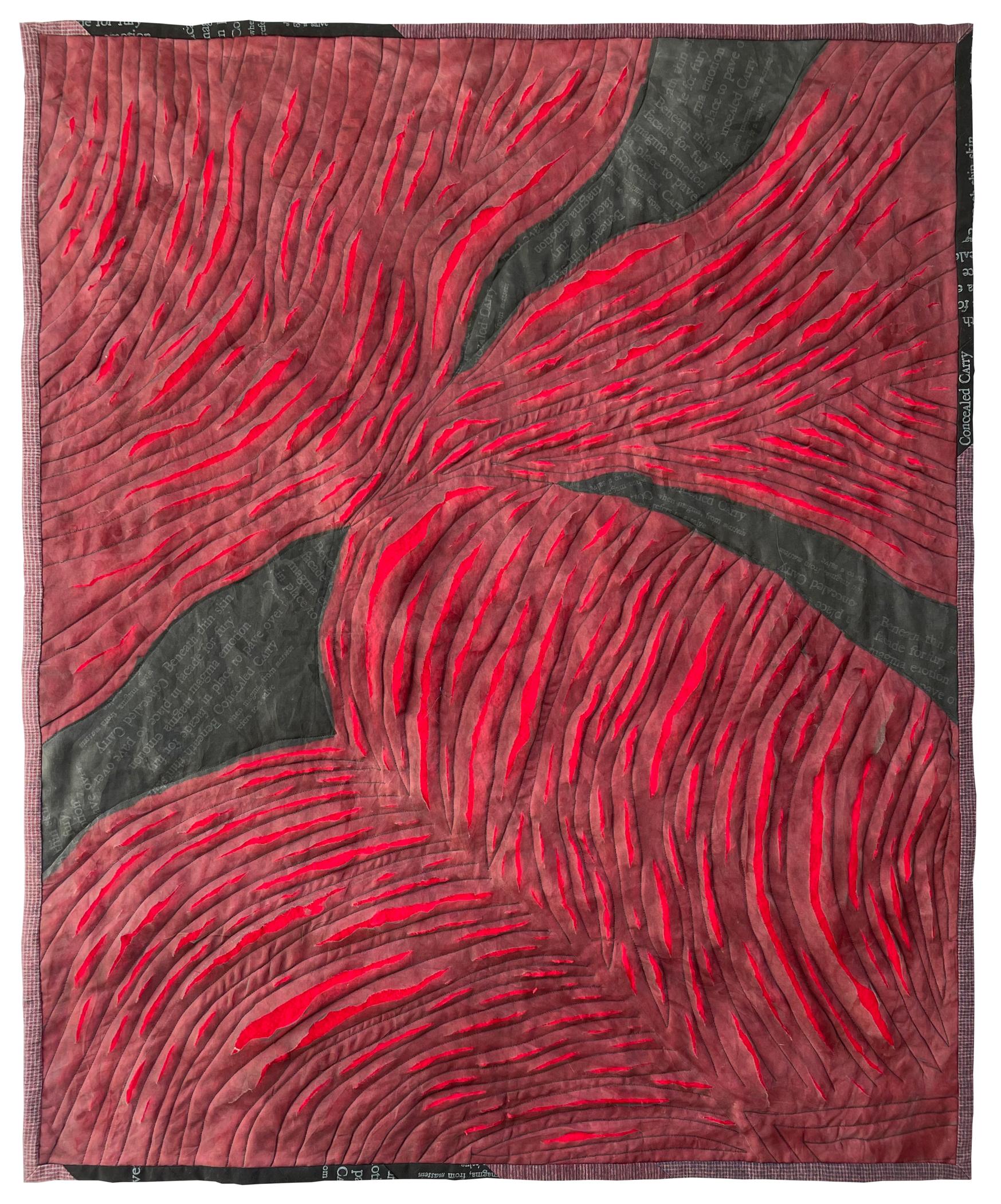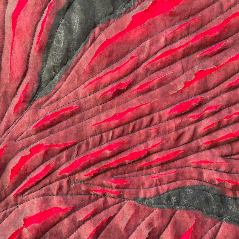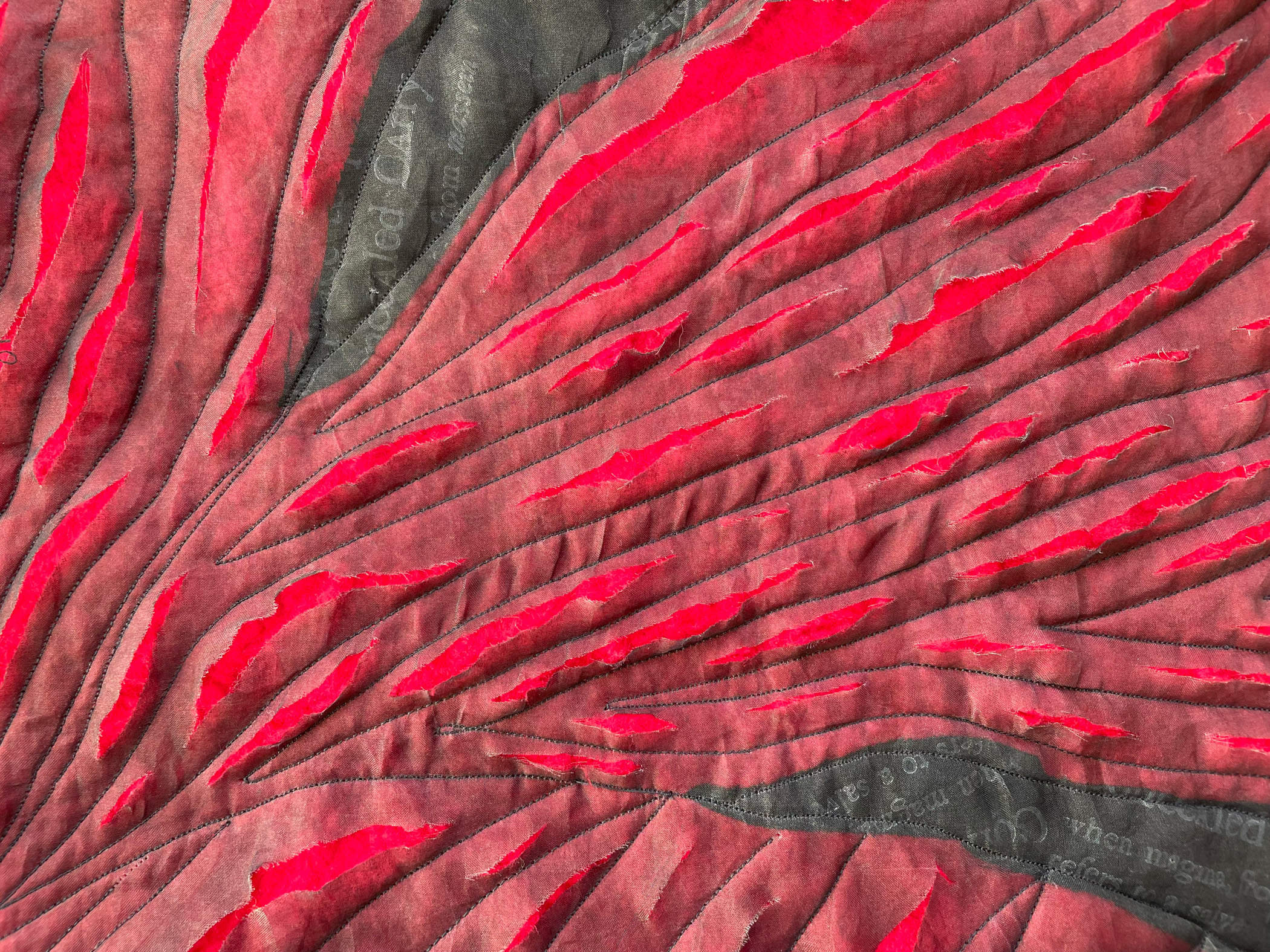 Letterpress printed, hand dyed and pigmented, machine quilted, slashed