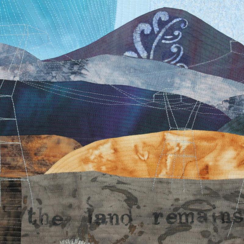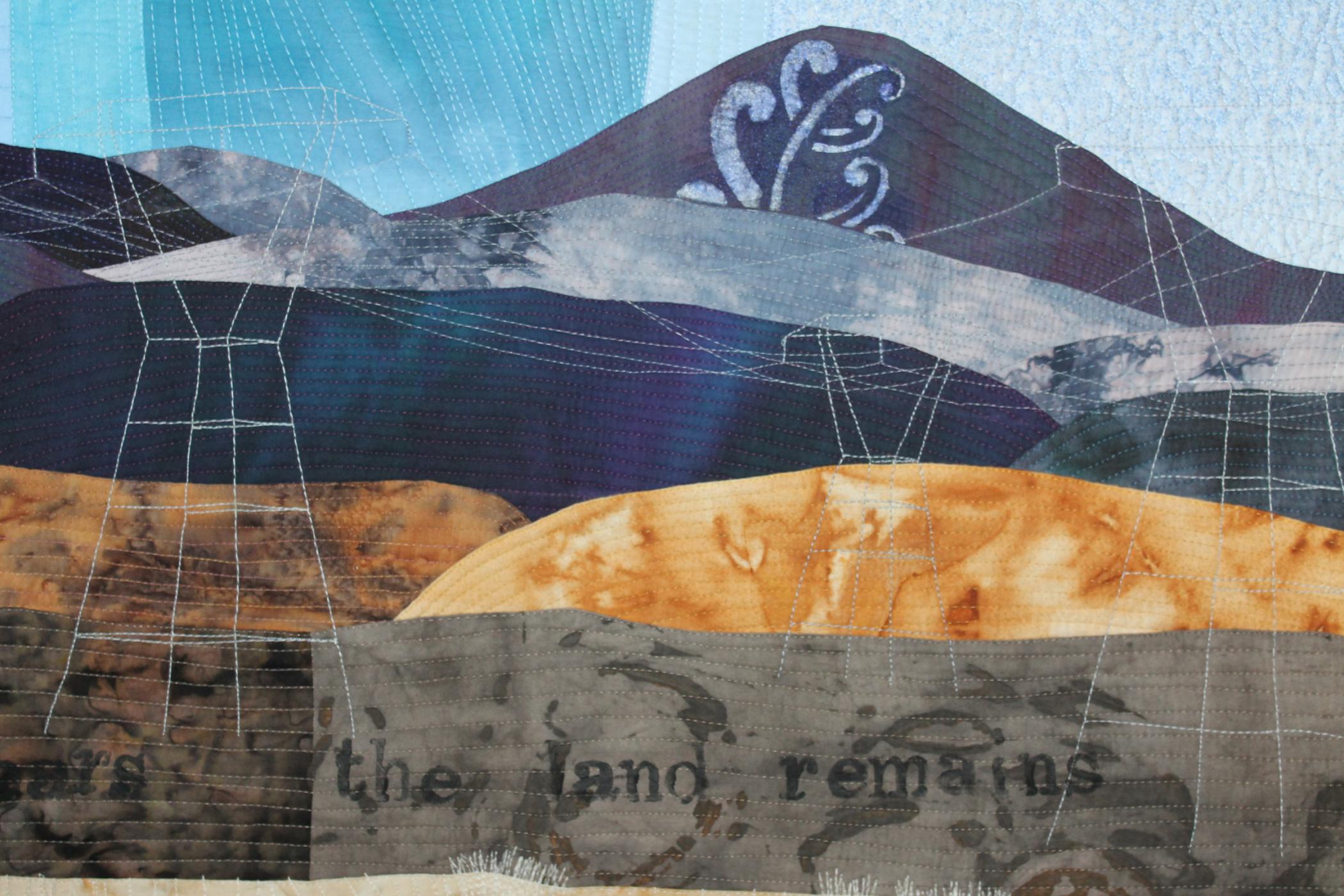 Cotton with wool batting, piecing, machine quilting, hand dyed fabric, stamping textile ink.