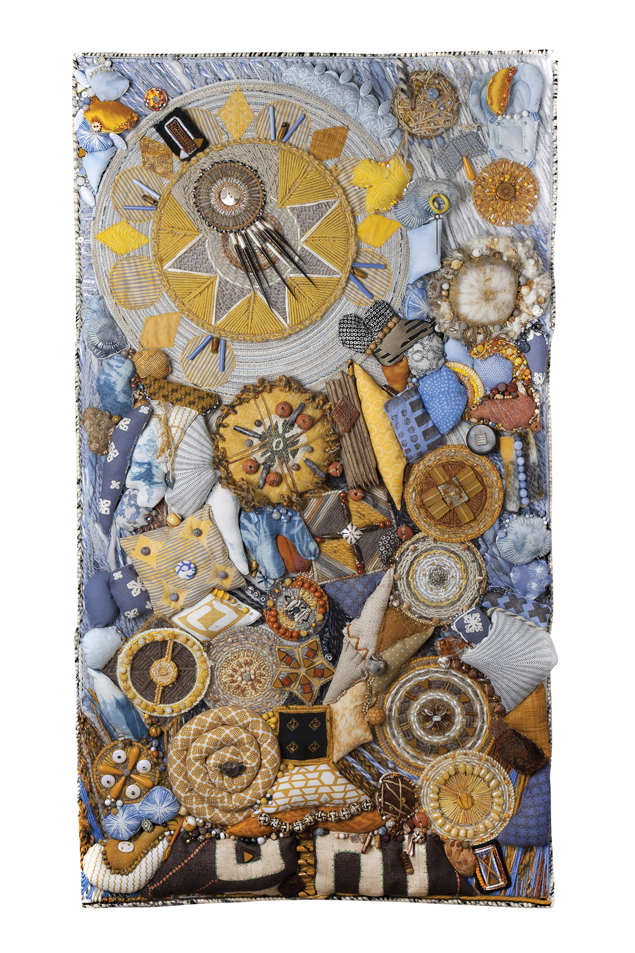 Wooden stretchers, plastic canvas, hardware, fabric, yarn, various fibers, beads, buttons, porcupine quills